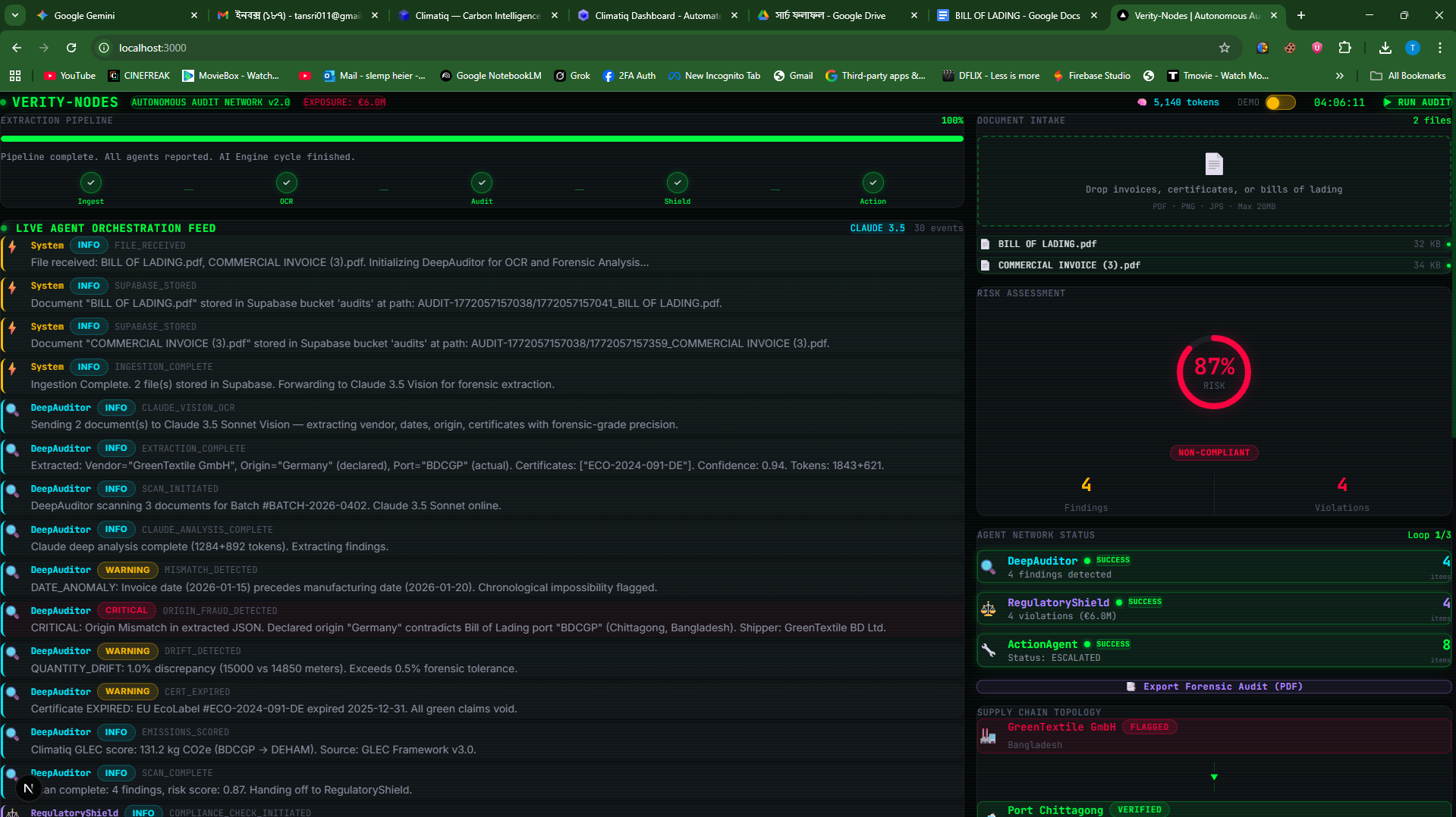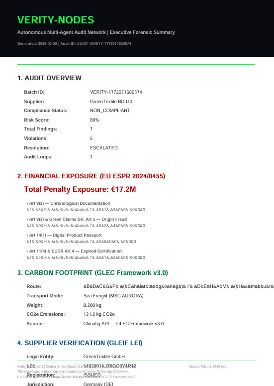 Verity-Nodes is an autonomous multi-agent audit network that uses Claude 3.5 Sonnet Vision to perform forensic-grade document extraction. It cross-references Invoices and Bills of Lading to detect fraud, calculates carbon footprints via Climatiq, and autonomously drafts "self-healing" corrective actions for non-compliant suppliers.