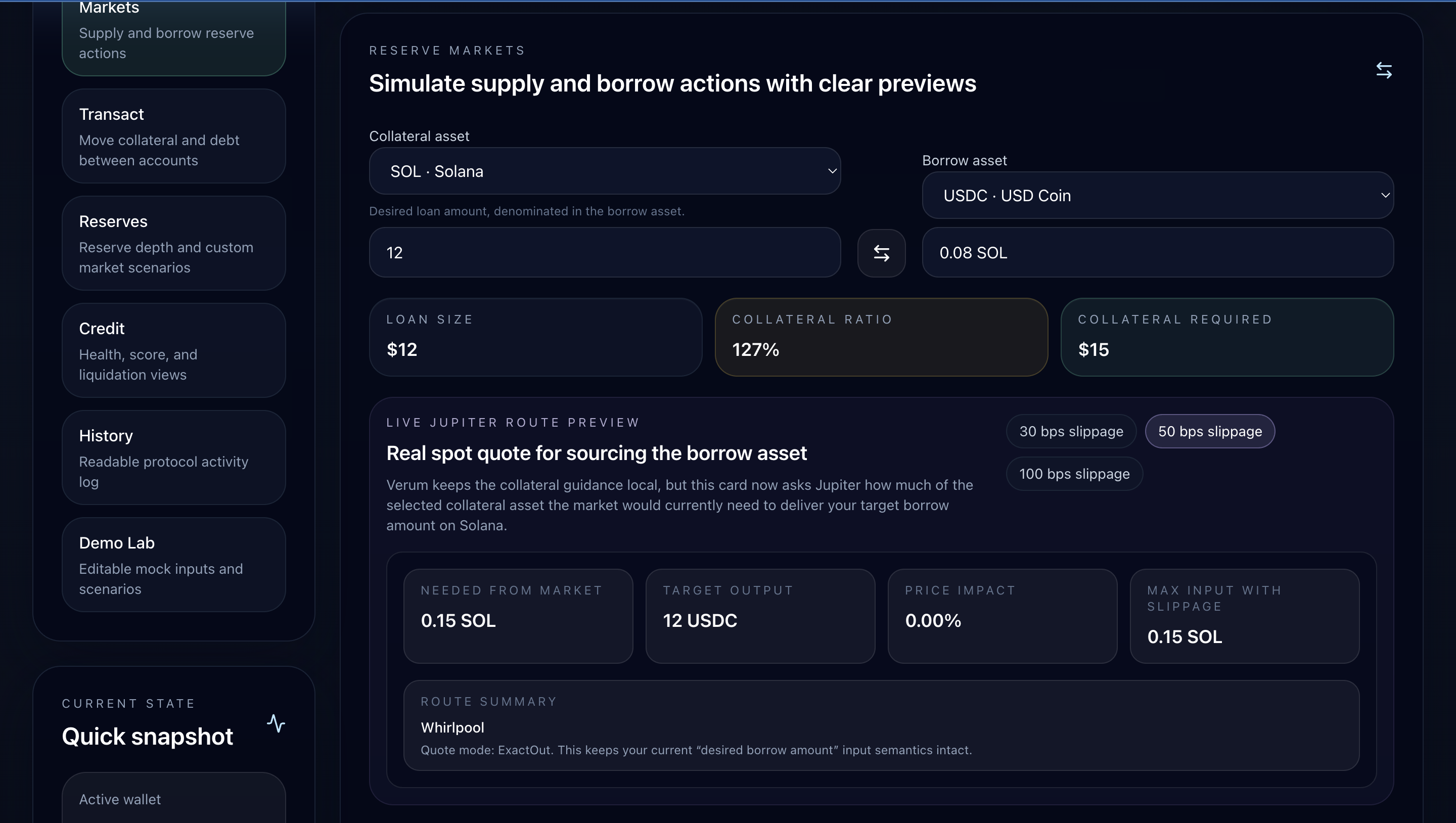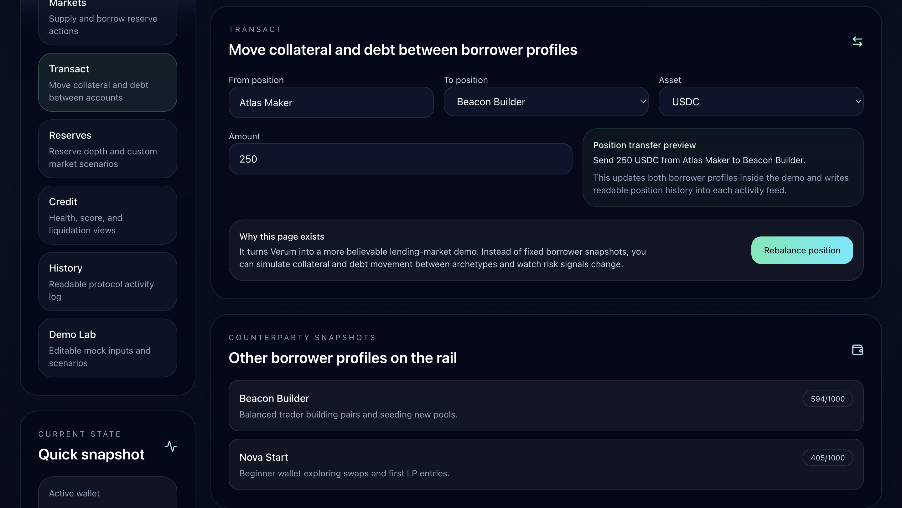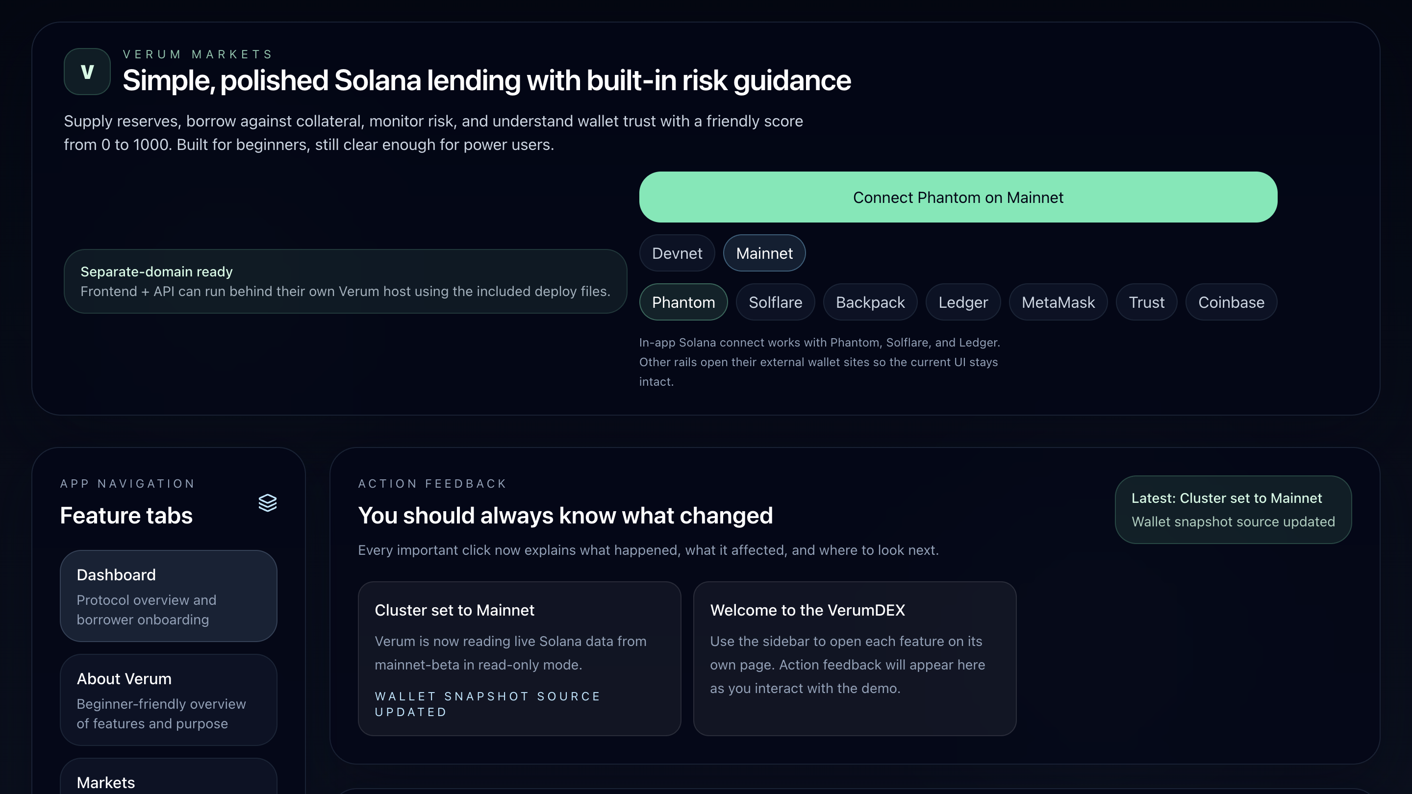 Verum Markets is a Solana lending interface with built-in risk guidance and a wallet trust score from 0 to 1000. You supply reserves, borrow against collateral, and watch your terms shift based on your actual on-chain behavior, trade volume, liquidity participation, repayment history, and more. Higher score, lower collateral ratio. It's designed to be readable by a beginner and still useful to someone who knows what a health factor is.
