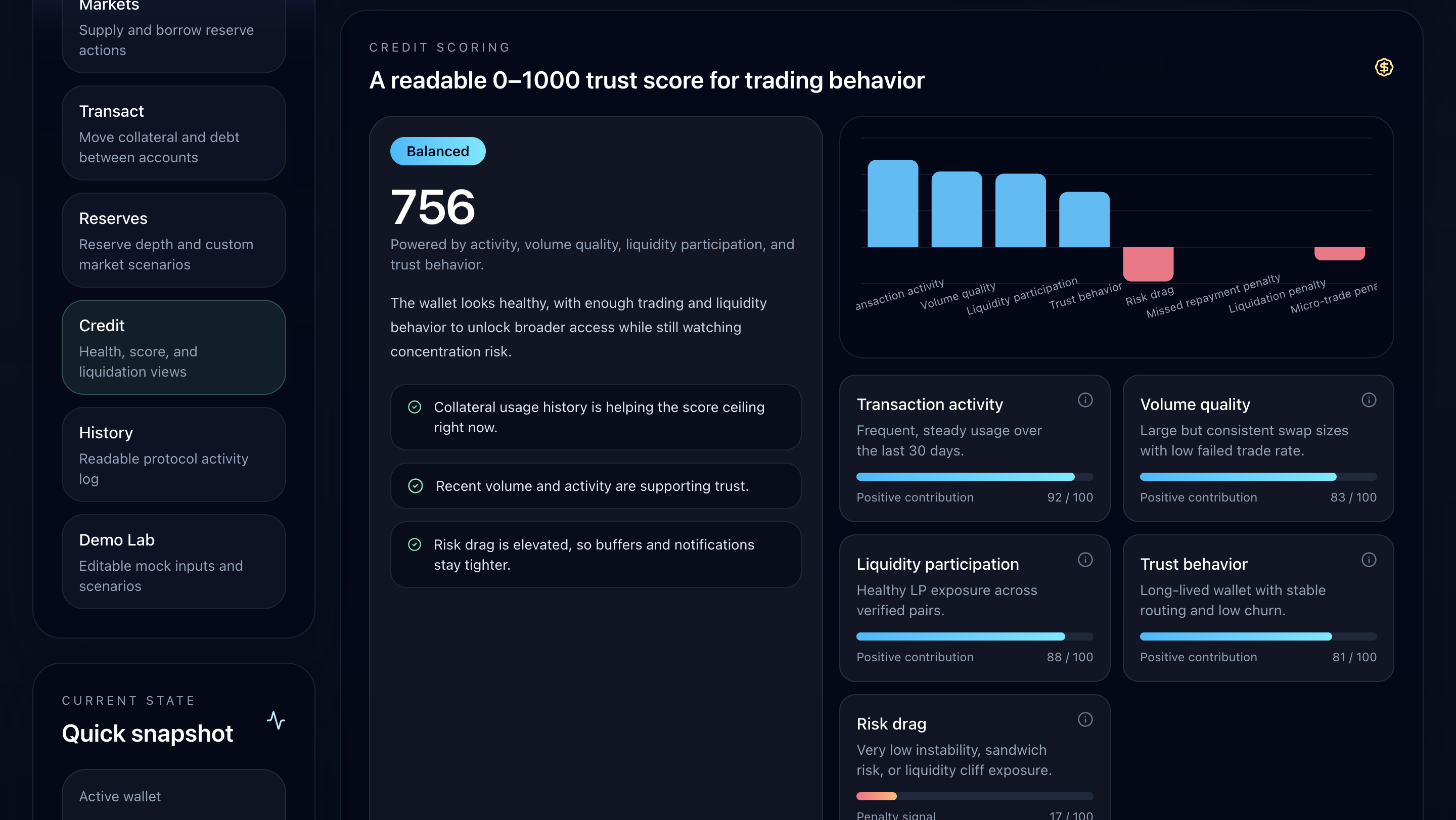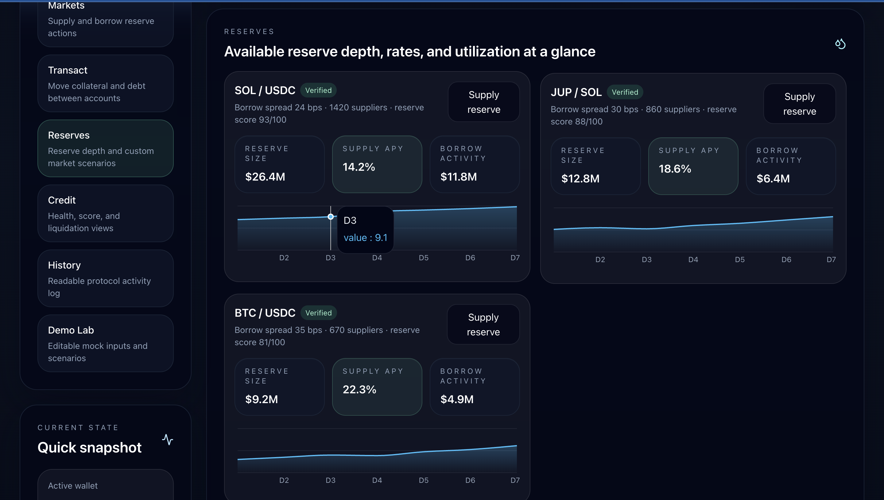 We built the frontend in React with a Jeton-inspired command center layout, and each core action (supply, borrow, transact, monitor) lives on its own page accessible from the sidebar. The credit scoring model pulls from several behavioral signals: transaction cadence, average trade size, LP activity, wallet age, and penalty inputs like liquidations or missed repayments. The market simulation calculates required collateral in real time from the user's score. Wallet (MetaMask, Phantom, Solflare, Trust, Ledger) integration handles connection state and provides a devnet balance preview for live-connected wallets.