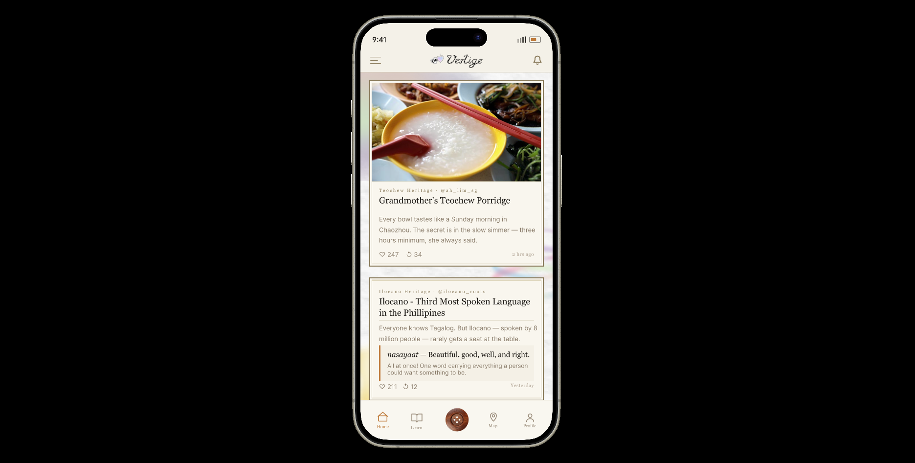 Vestige is a community-driven platform for cultural reconnection. Through a navigable globe, users explore "traces" of heritage—shared dialects, traditional crafts, and family histories—contributed by others. It allows individuals to "reignite" their own cultural identity by documenting their personal journey and sharing it with a global network, turning fragmented memories into a vibrant, shared community.