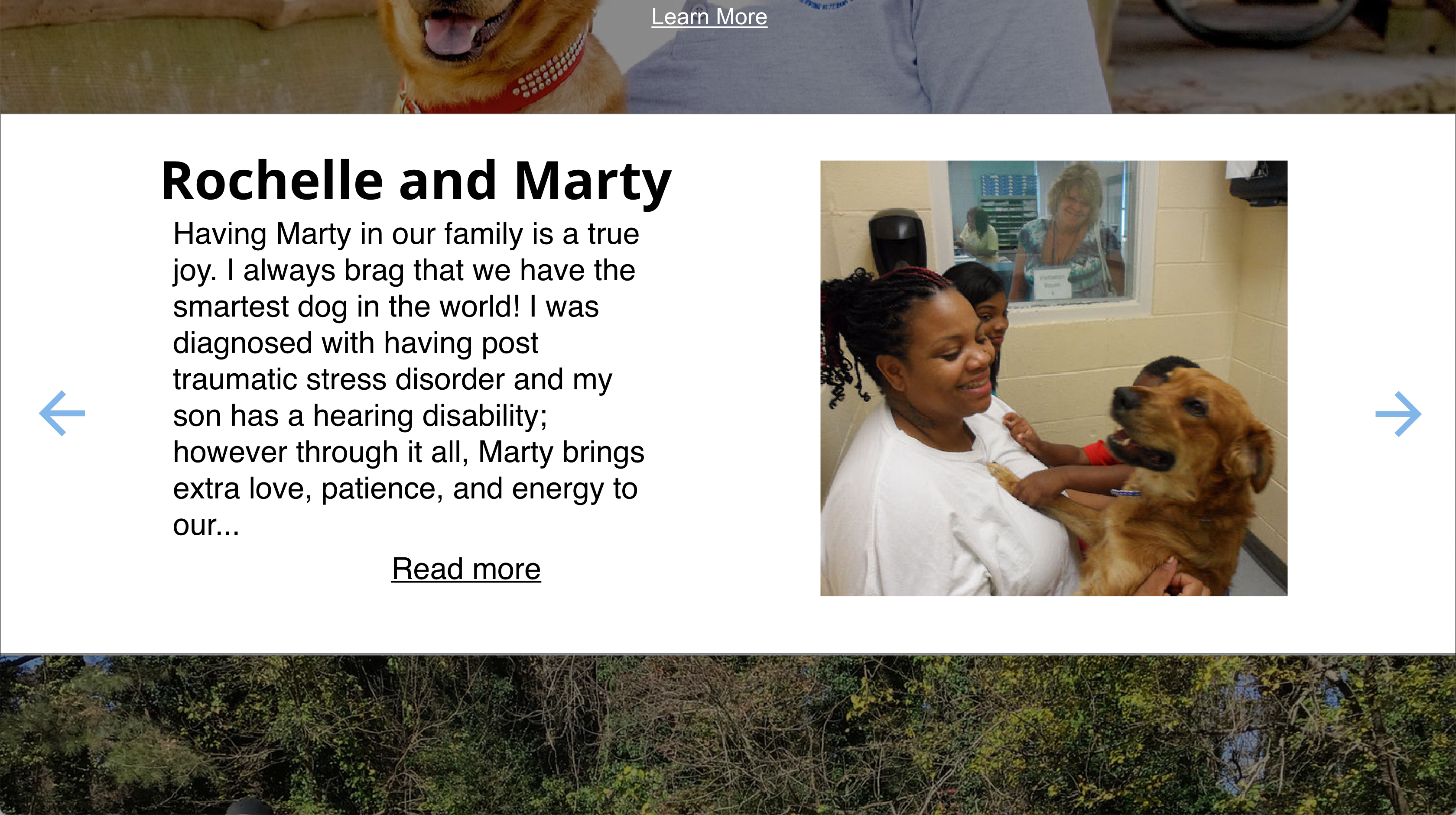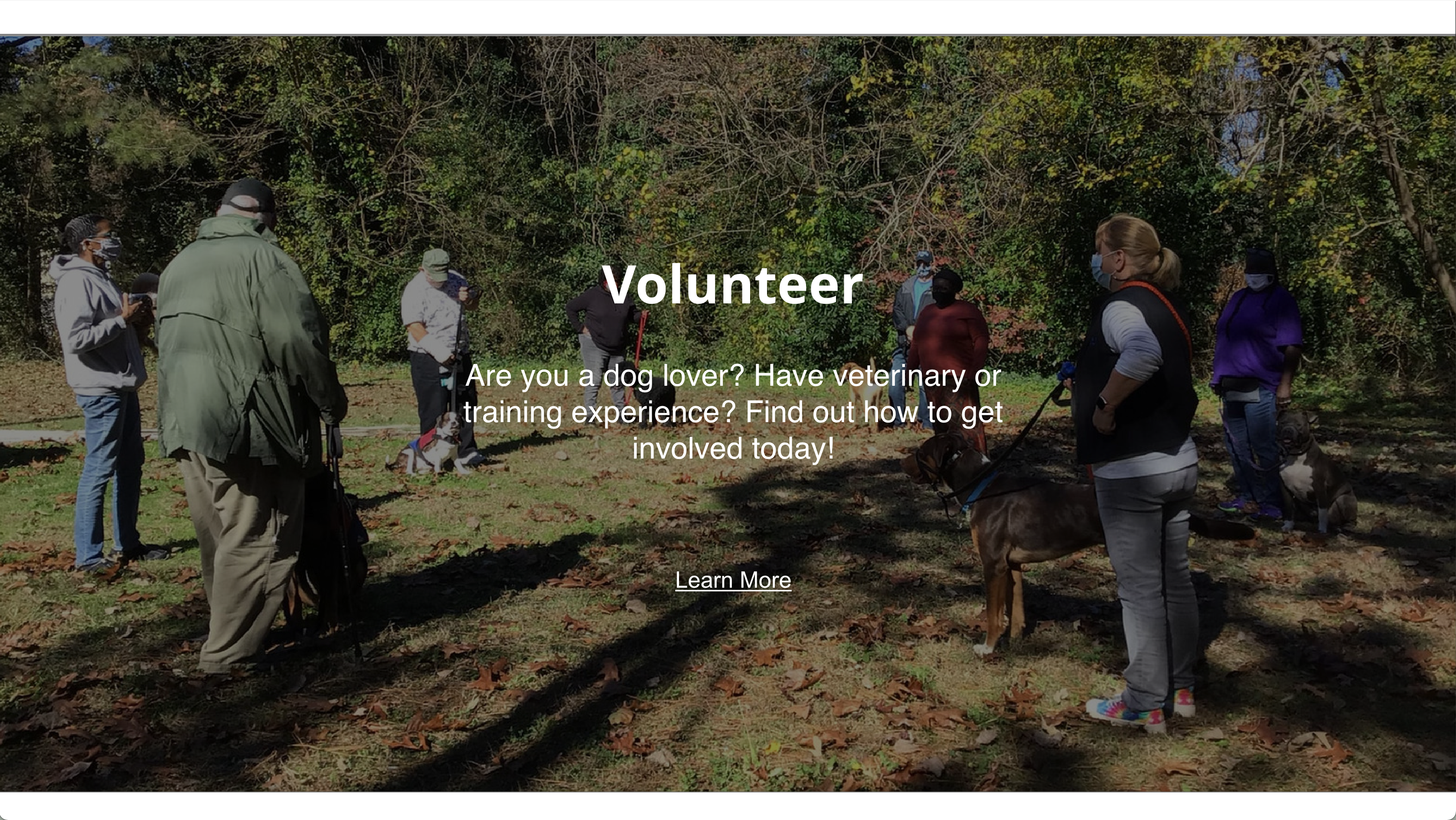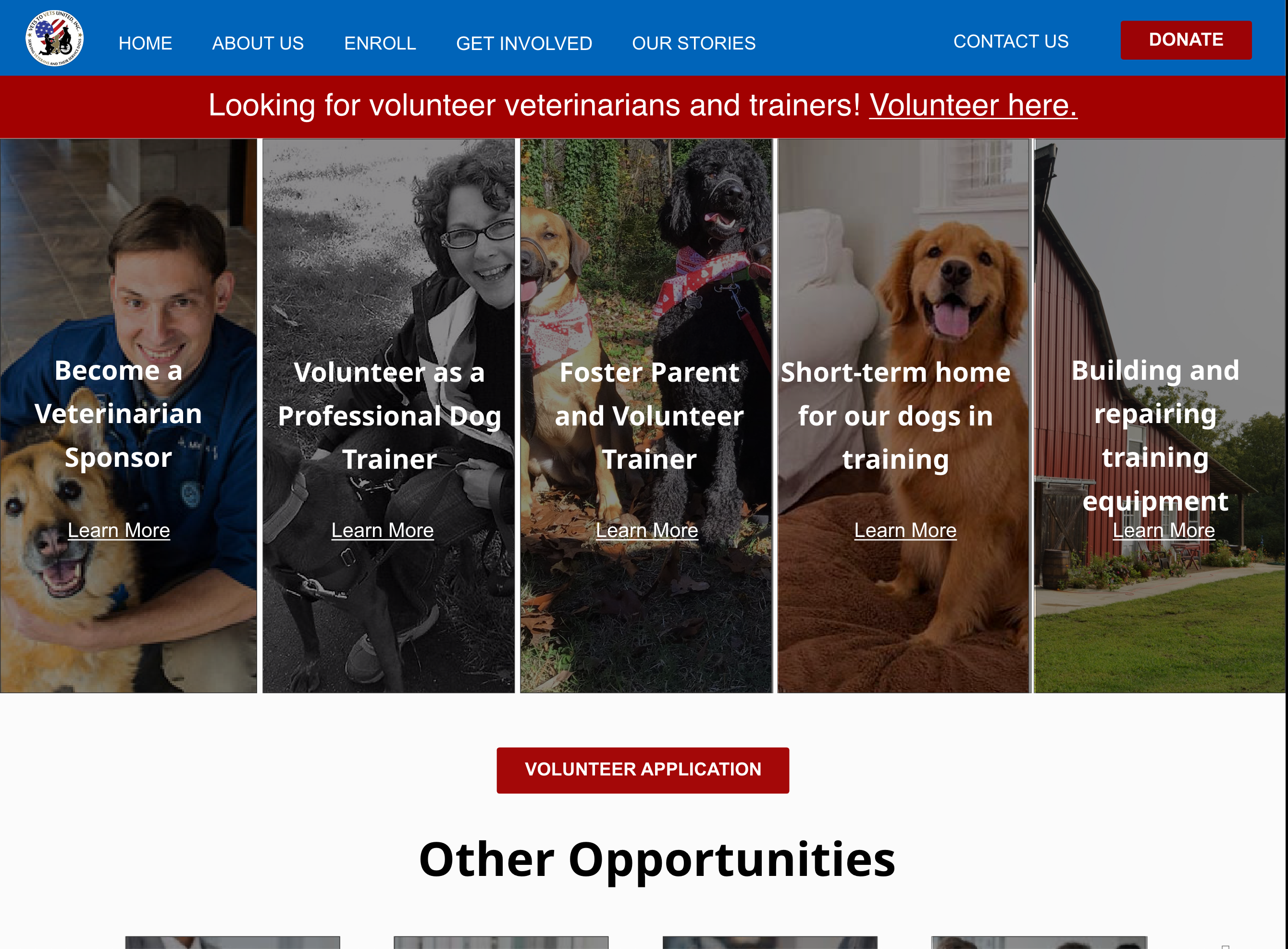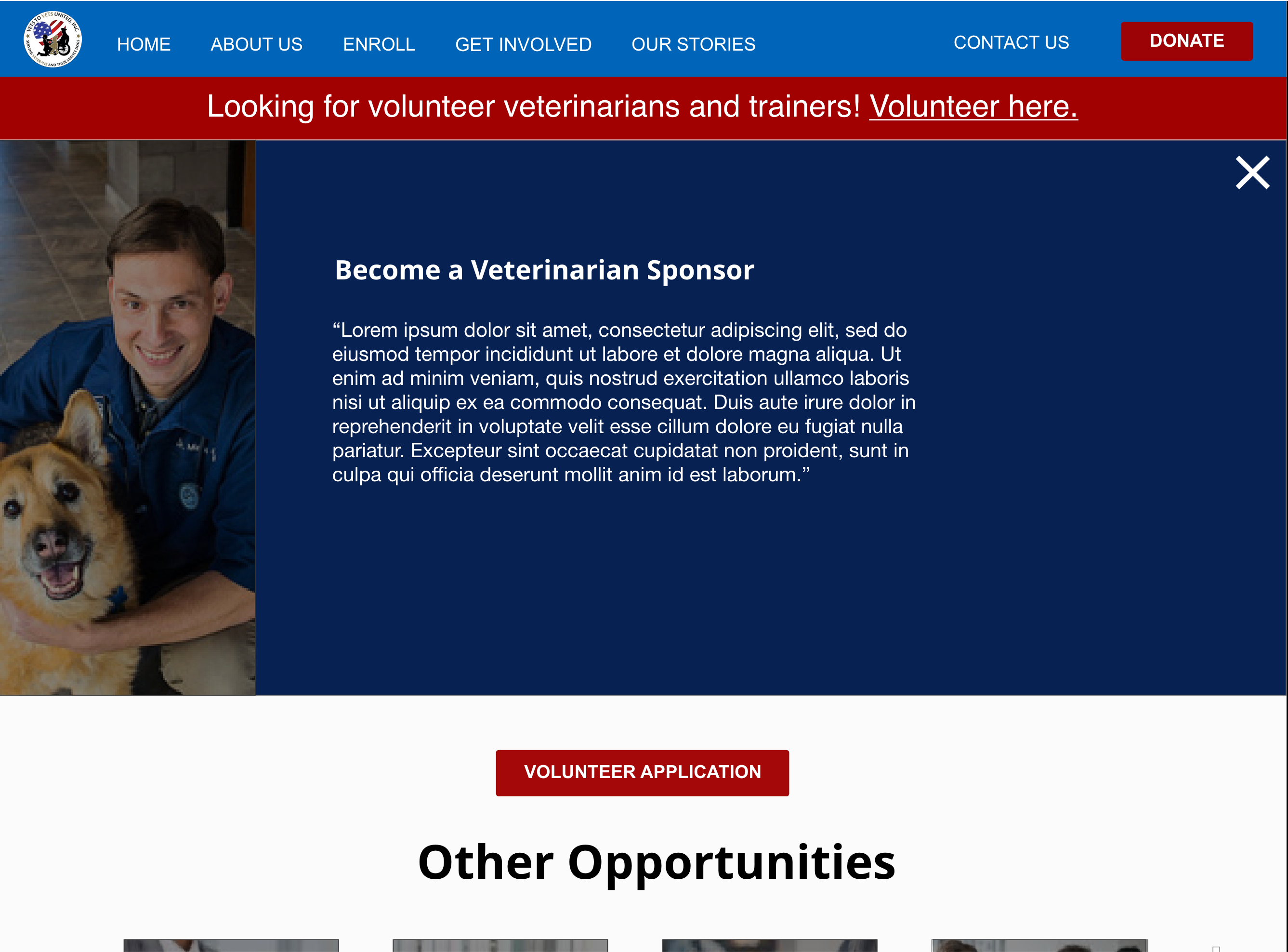 After speaking with the Executive Director and Founder of Vets to Vets United, Dr. Terry Morris, our team became inspired by Vets to Vets United’s work facilitating meaningful relationships between veterans and service dogs and specifically, Dr. Morris’s passion for this mission. She relayed to us the struggles she faced building this organization from the ground up, and also expressed an immense amount of pride in where the organization currently stands. Furthermore, she conveyed many different ways that she hoped the organization could grow in the future, which inspired us to use our design skills to help the organization come closer to these goals. In the hopes of increasing engagement and exposure of the organization’s website and therefore details of their work and ways to get involved, we were motivated to remodel their website to draw attention to areas the organization was previously struggling to advertise, such as volunteer opportunities.