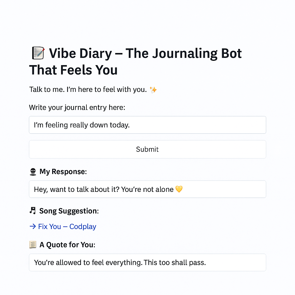 Vibe Diary – The Journaling Bot That Feels You 🌟 Inspiration We were inspired by the emotional ups and downs that people face every day, especially students, remote workers, and anyone battling stress, anxiety, or loneliness. Journaling has long been a therapeutic tool—but it can feel static, and many people give up quickly. We wanted to create a companion, not just a diary—something that feels you, responds to you, and actually lifts your vibe.