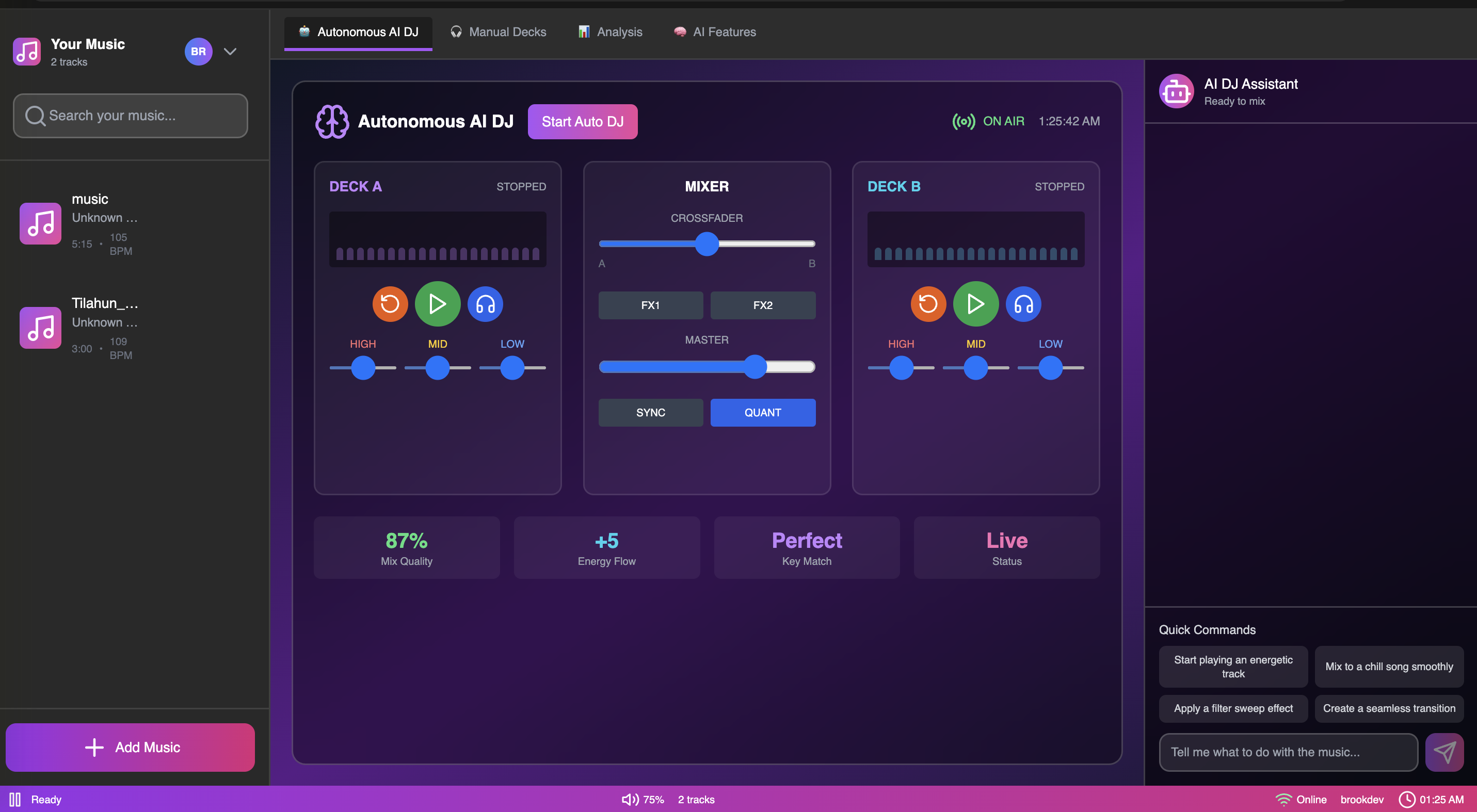 To revolutionize the DJ industry by building an intelligent, AI-powered cross-platform DJing system that democratizes music mixing and performance. AIDJ combines real-time audio processing, machine learning, and intuitive design to empower both beginners and professionals to create, share, and enjoy seamless music experiences.