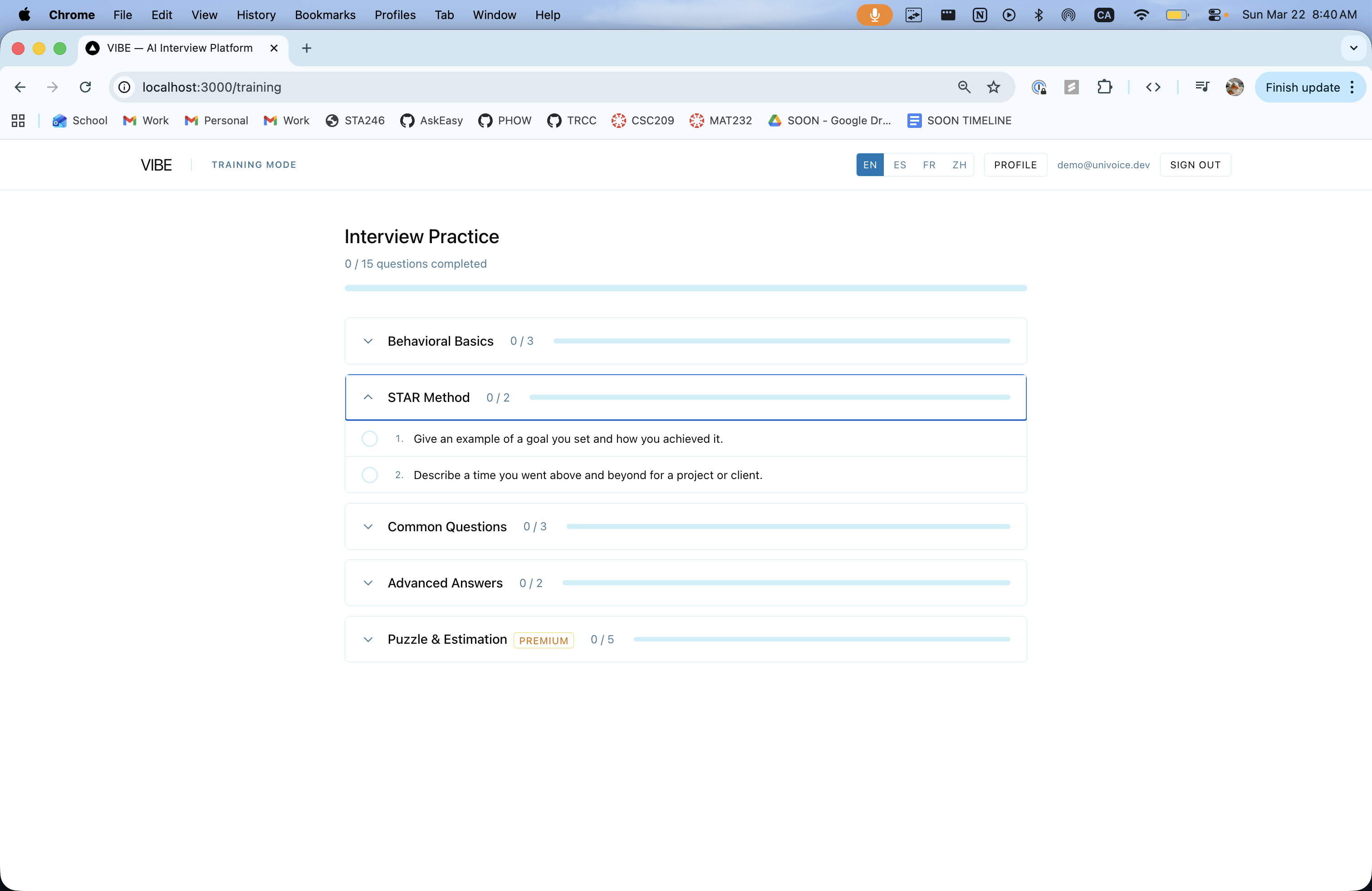 The Puzzle Builder: This is our most original contribution. Instead of asking candidates to write STAR answers from scratch (intimidating) or giving them a template (generic), we let them build answers from their own experiences using drag-and-drop. The purple filler words make the AI's contribution transparent.