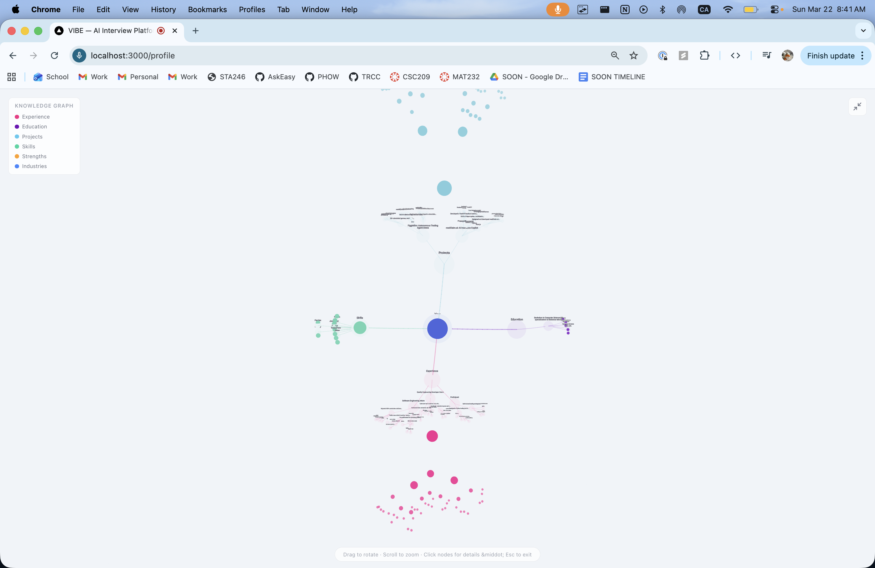 Candidates upload their resume (PDF or text). GPT-4o-mini extracts structured data-skills, experiences, education, projects-and builds a 3D interactive knowledge graph rendered in Three.js. This five-tier hierarchical visualization (You → Sections → Items → Details → Keywords) isn't just eye candy: it powers personalized STAR feedback and live AI suggestions that reference the candidate's actual background.
