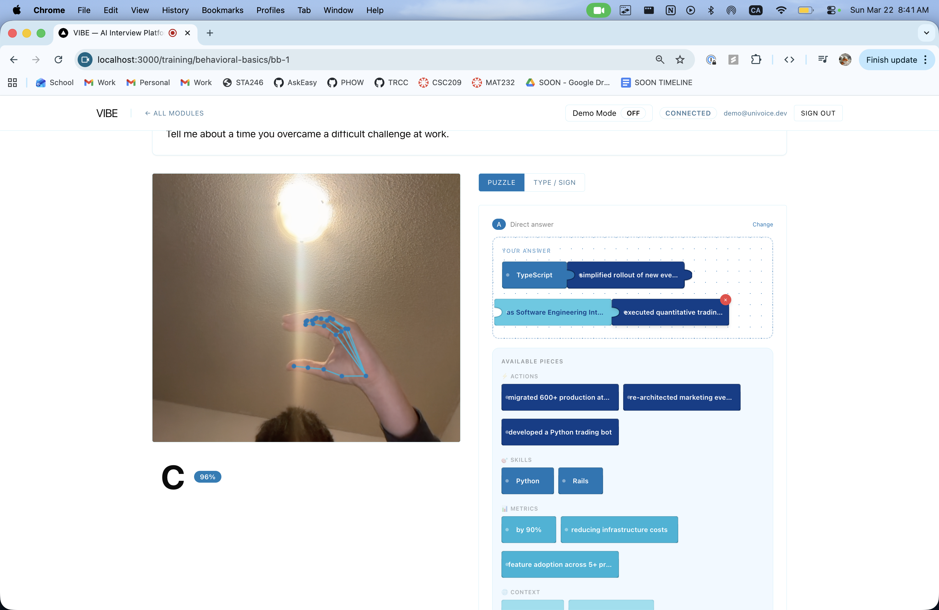 VIBE (Voice Inclusion for Better Employment) bridges the gap between sign language and spoken interviews. Rather than asking candidates to adapt to an inaccessible system, VIBE adapts the system to the candidate. We chose to build an end-to-end platform rather than a single-feature tool because the interview problem isn't one obstacle-it's a chain of them: understanding the interviewer, formulating a structured response, and delivering it clearly. VIBE addresses all three.