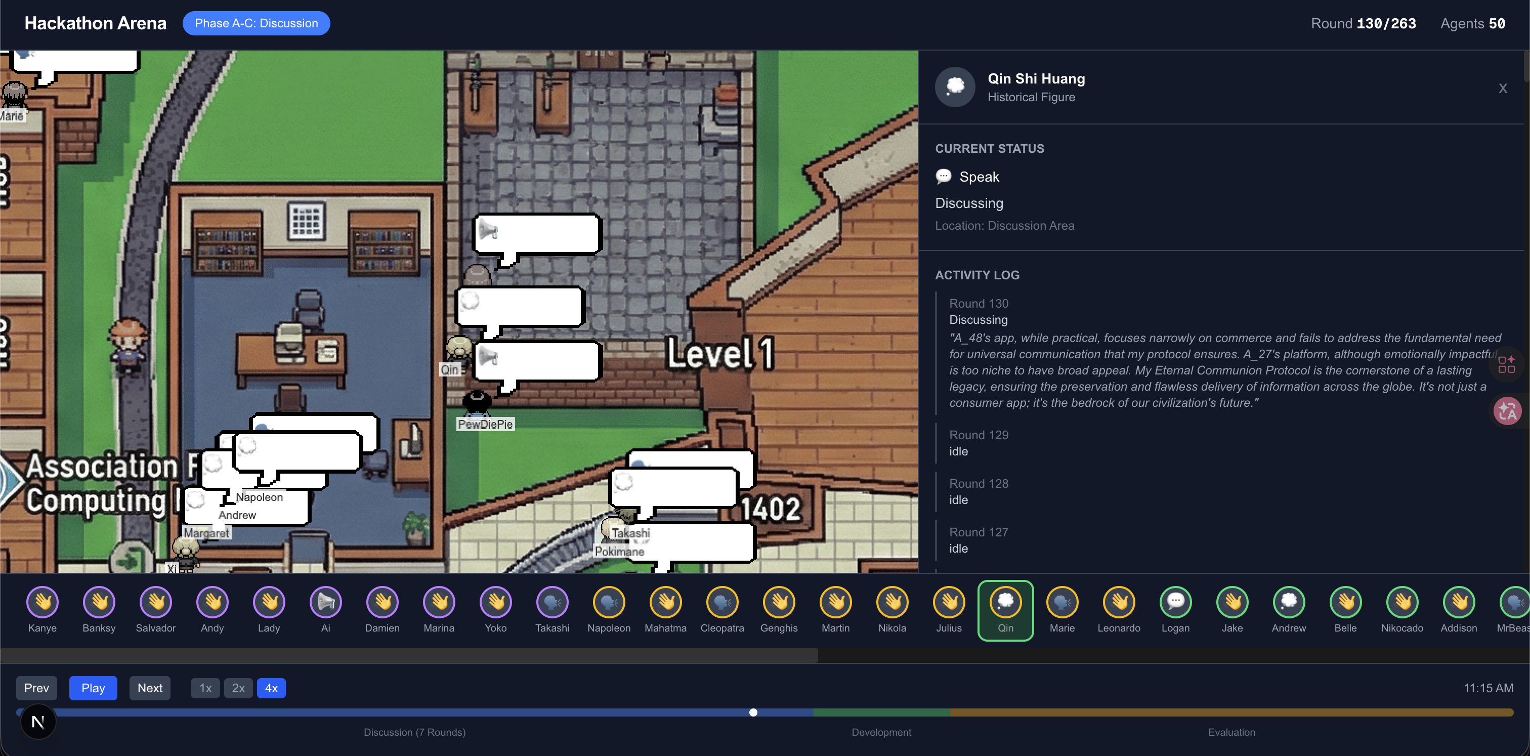 Picture Elon roasting Napoleon’s product roadmap, or Kanye dropping a wild creative bomb on Gandhi. We were obsessed with Stanford’s Generative Agents paper and the raw energy of real hackathons, so we decided to build the whole thing as a multi-agent social simulation. Every persona has its own personality baked in — not just a name, but actual psychological traits.