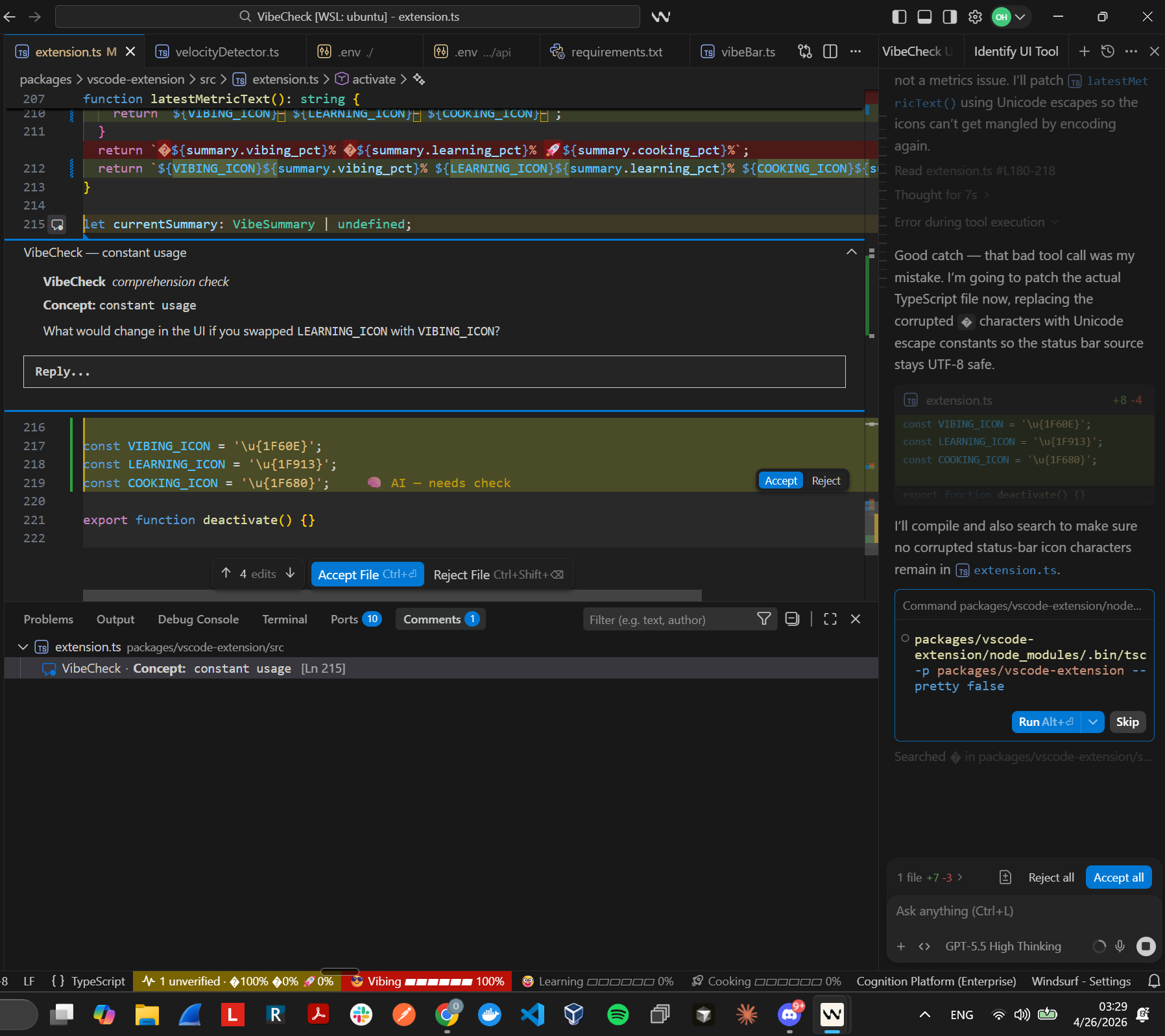 User Vibecoding and Missing a Comprehension Question (Vibing Identified at Bottom Bar)