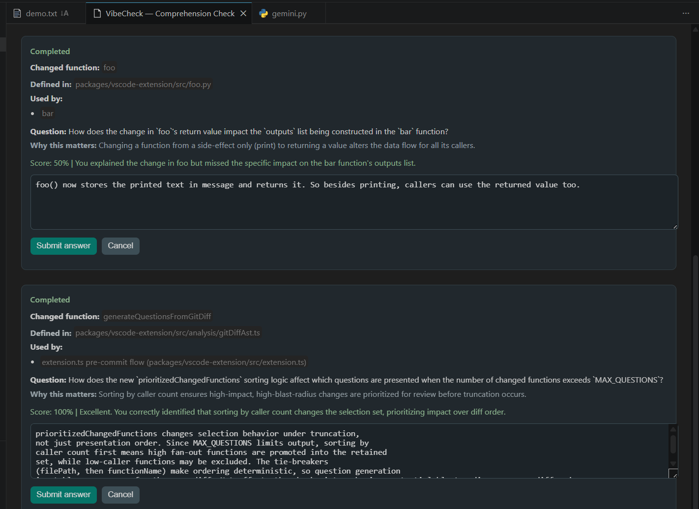 By turning every AI-generated change into a moment for verification, reflection, or exploration, VibeCheck helps developers ship faster without losing comprehension.
