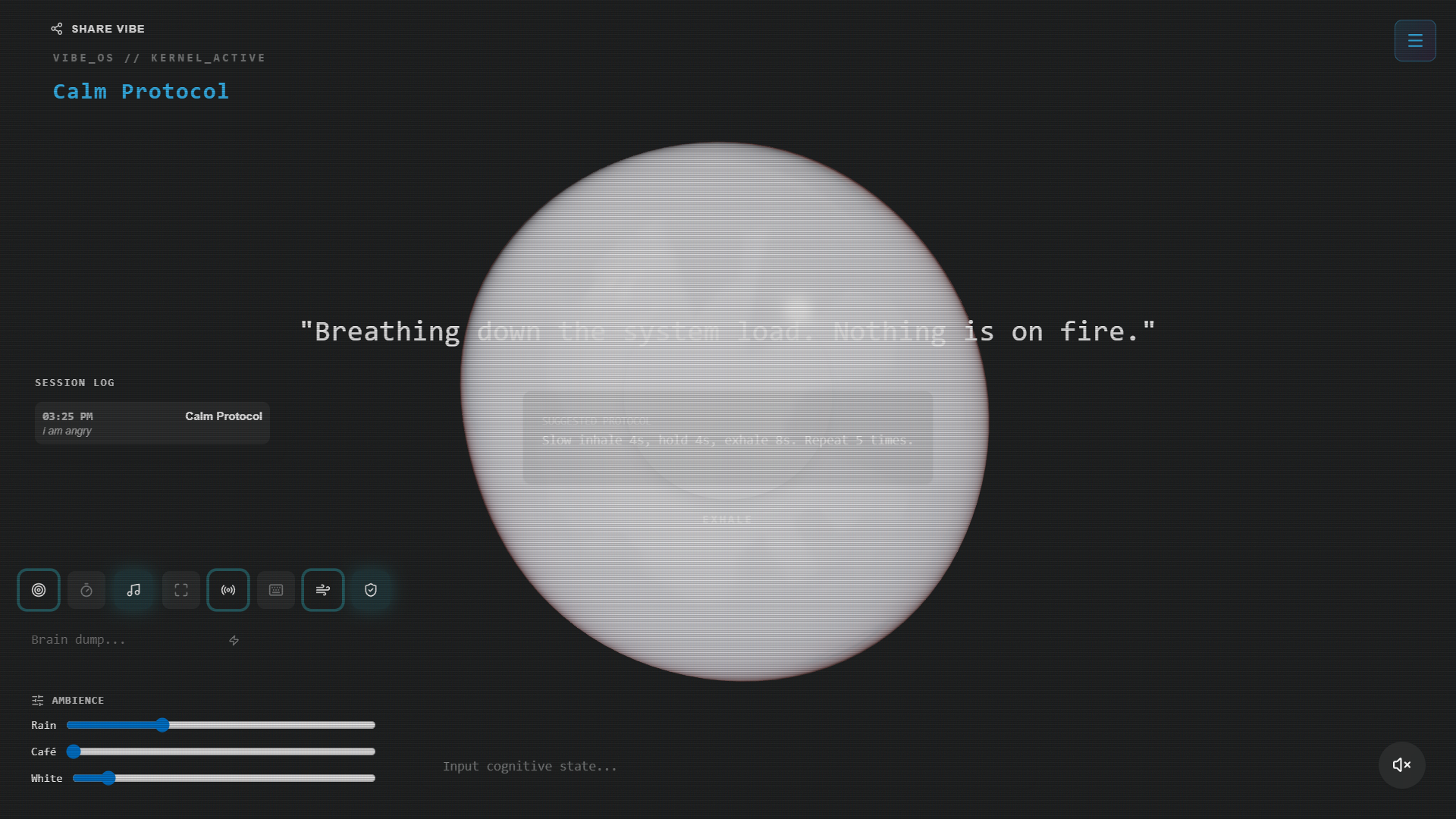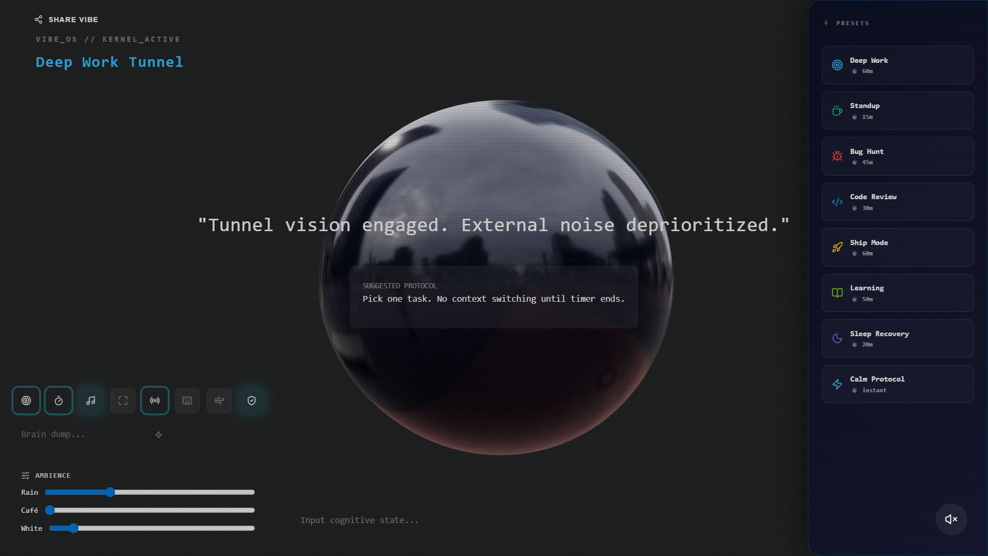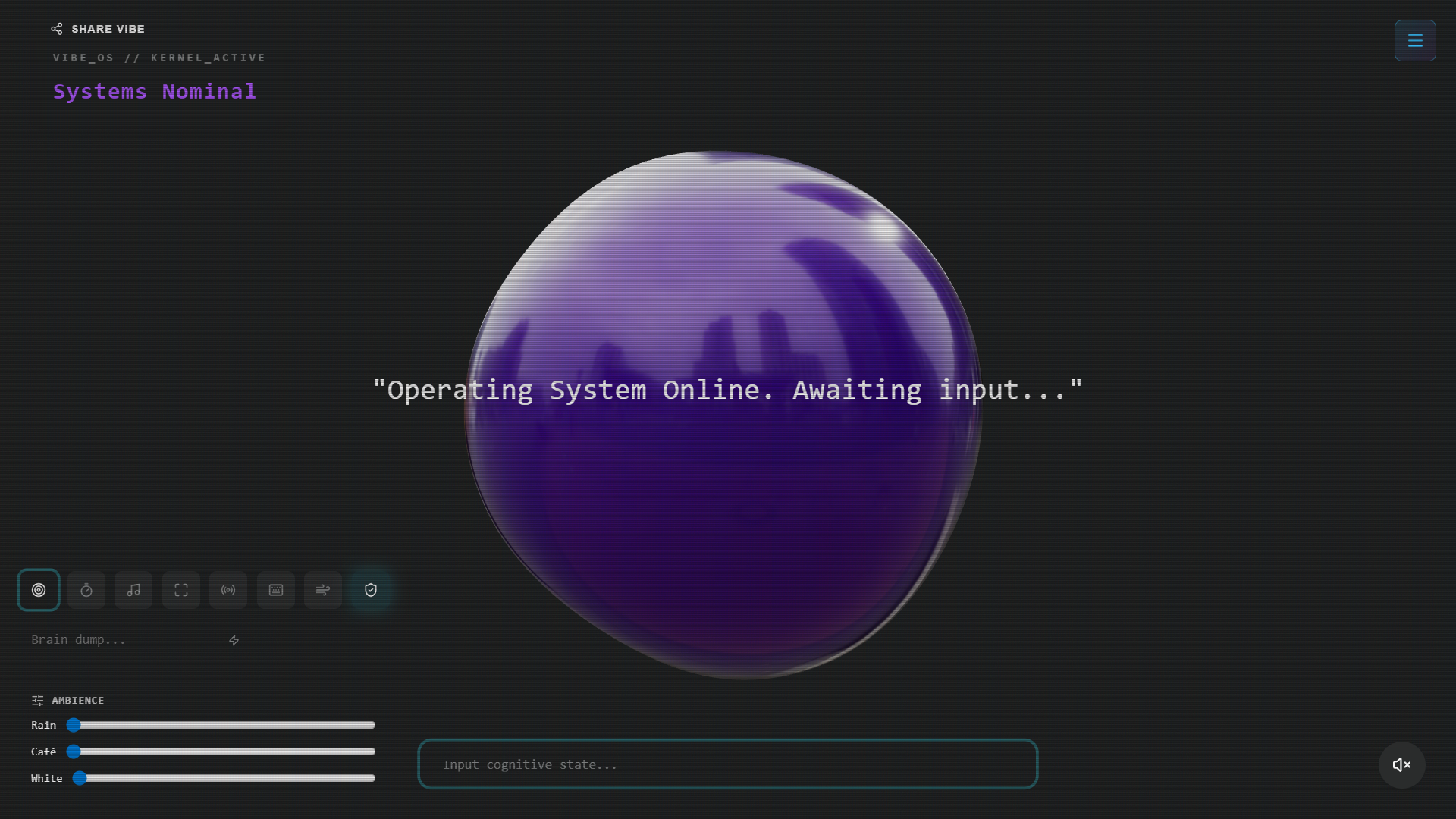 VibeOS is an experimental interface that behaves like a digital nervous system. It acts as an atmospheric regulator for your workspace.