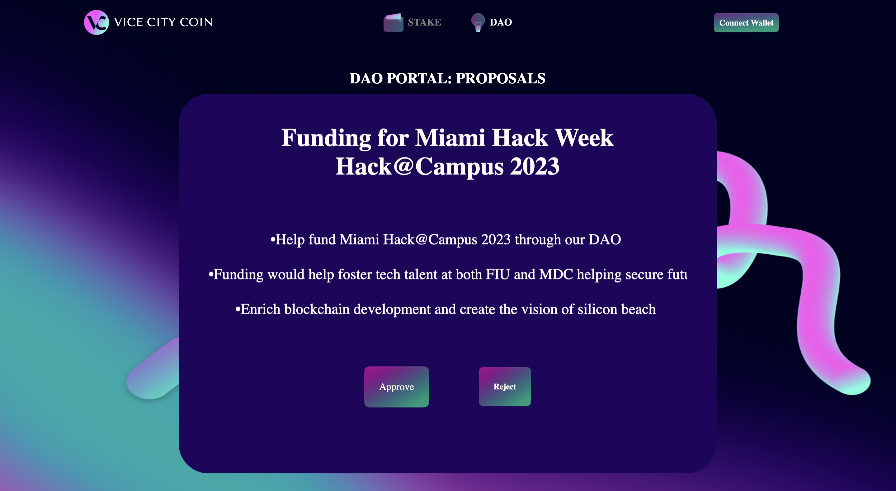 Vice City Coin alows non accrideted investers invest into Miami through Proof of Stake and a DAO. Using our platform, users can vote on what their investement may be used for.