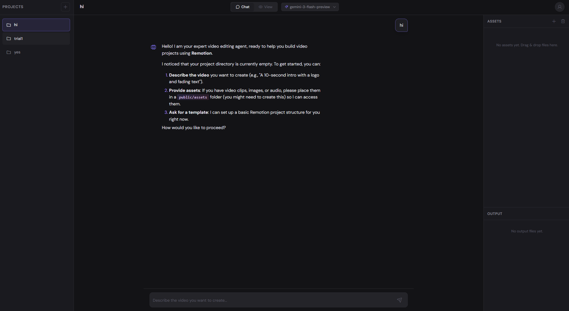 - Accepts a natural-language request, plans the edit, writes Remotion code, and renders outputs.