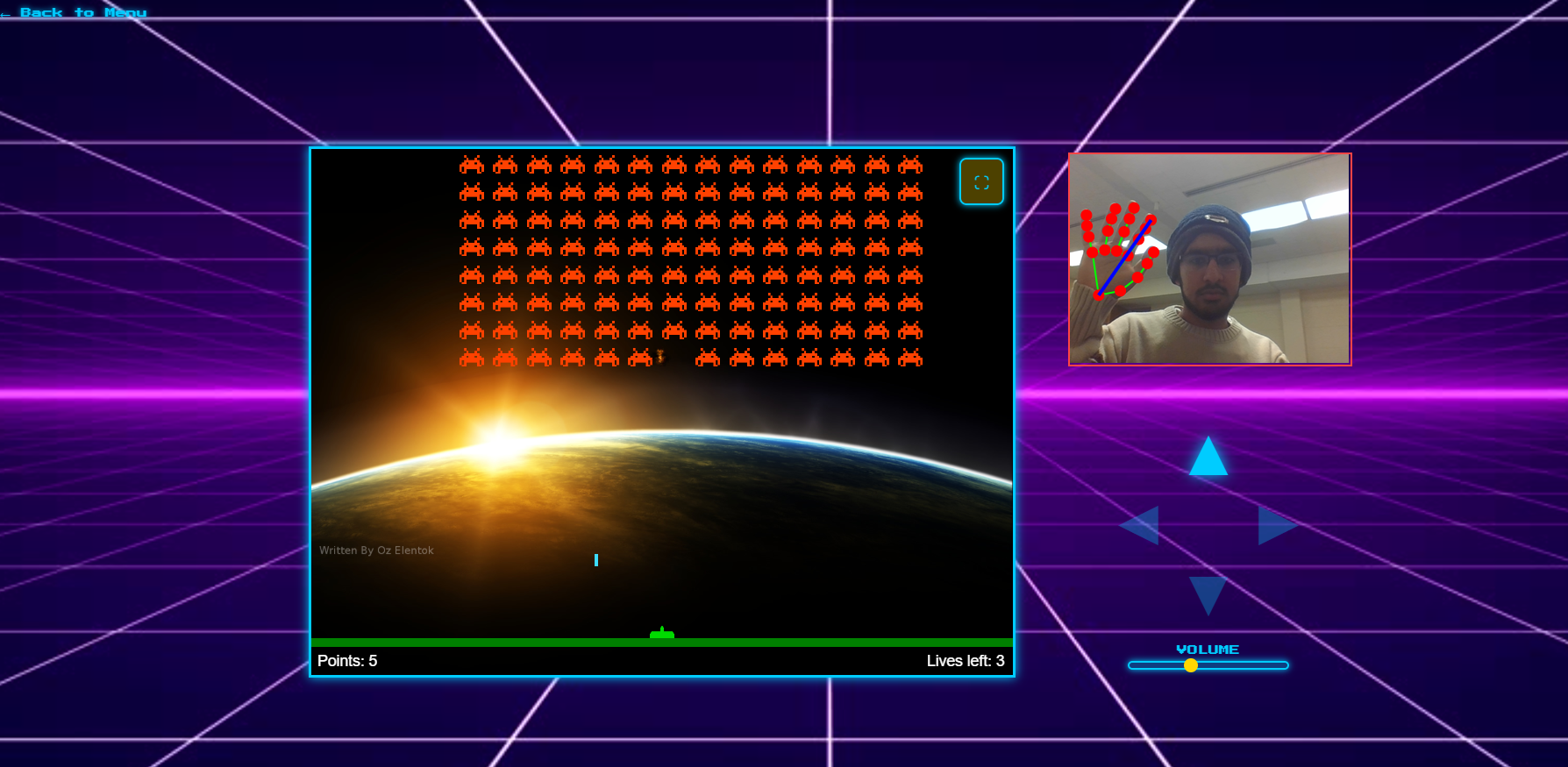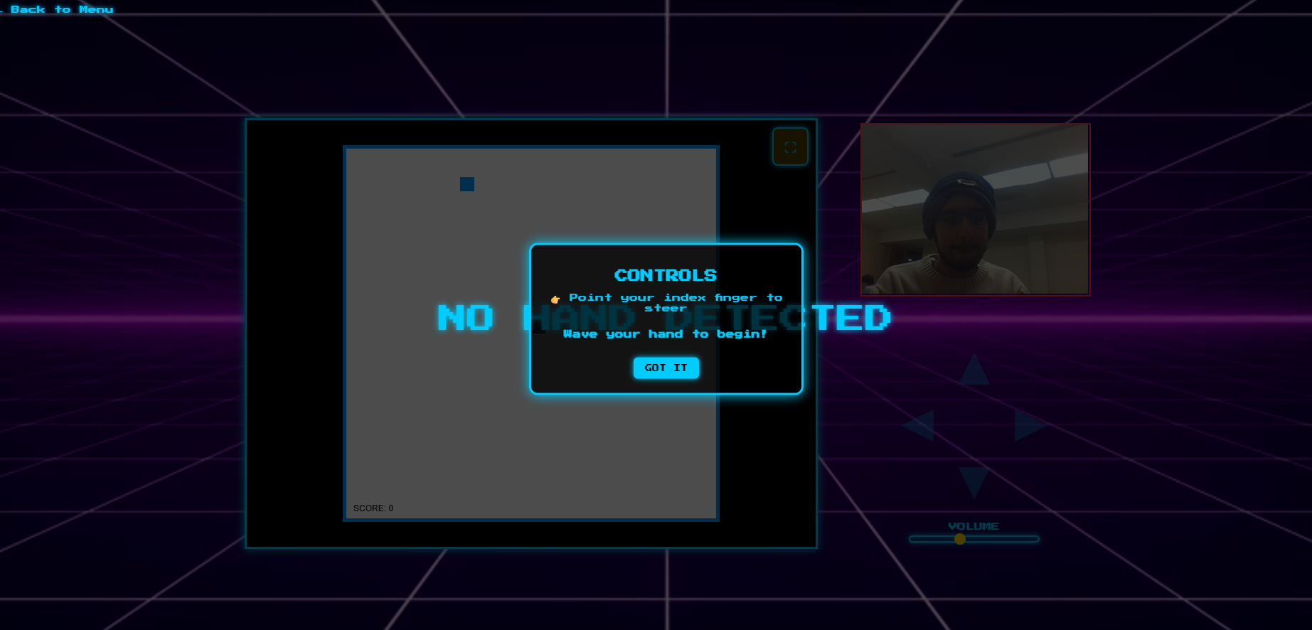 Built a fully functional controller-free gaming system in a weekend Achieved smooth, intuitive movement control Created an animated GIF-driven game selection menu Designed a polished retro landing page and UI Actually got games to turn when we waved our hand!