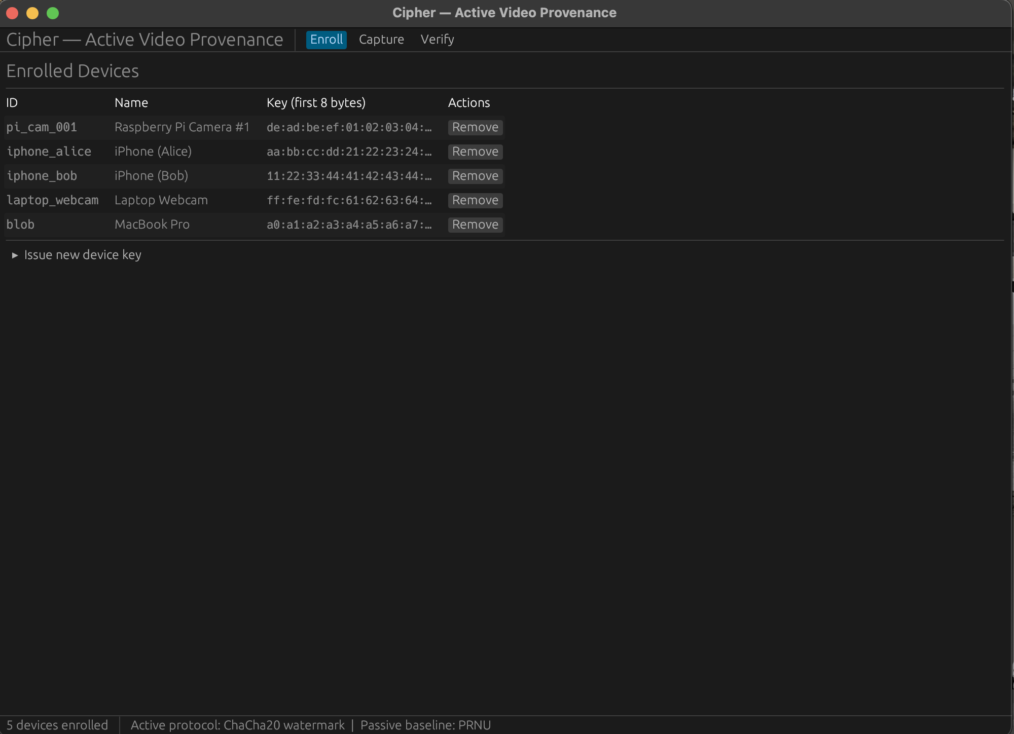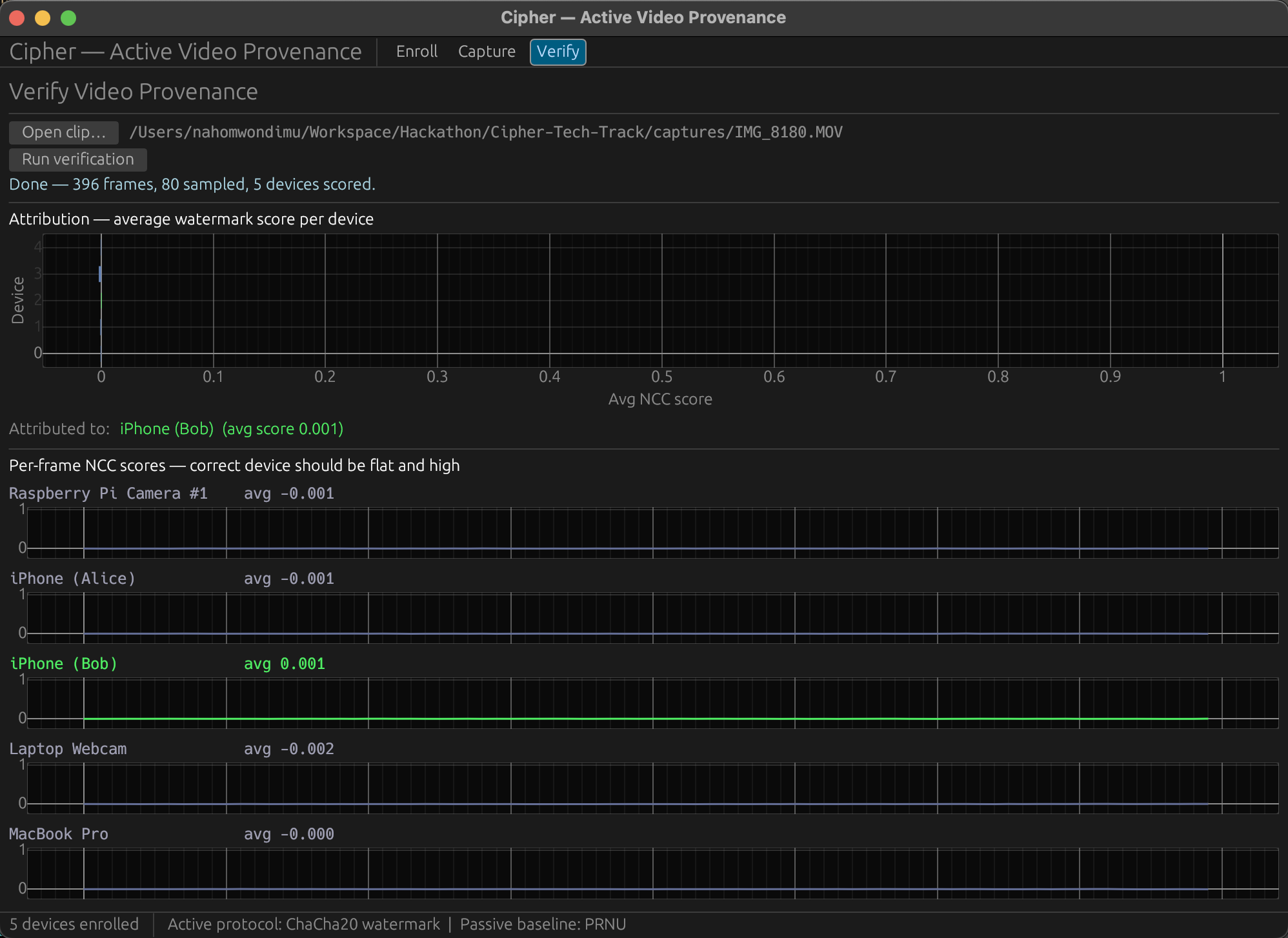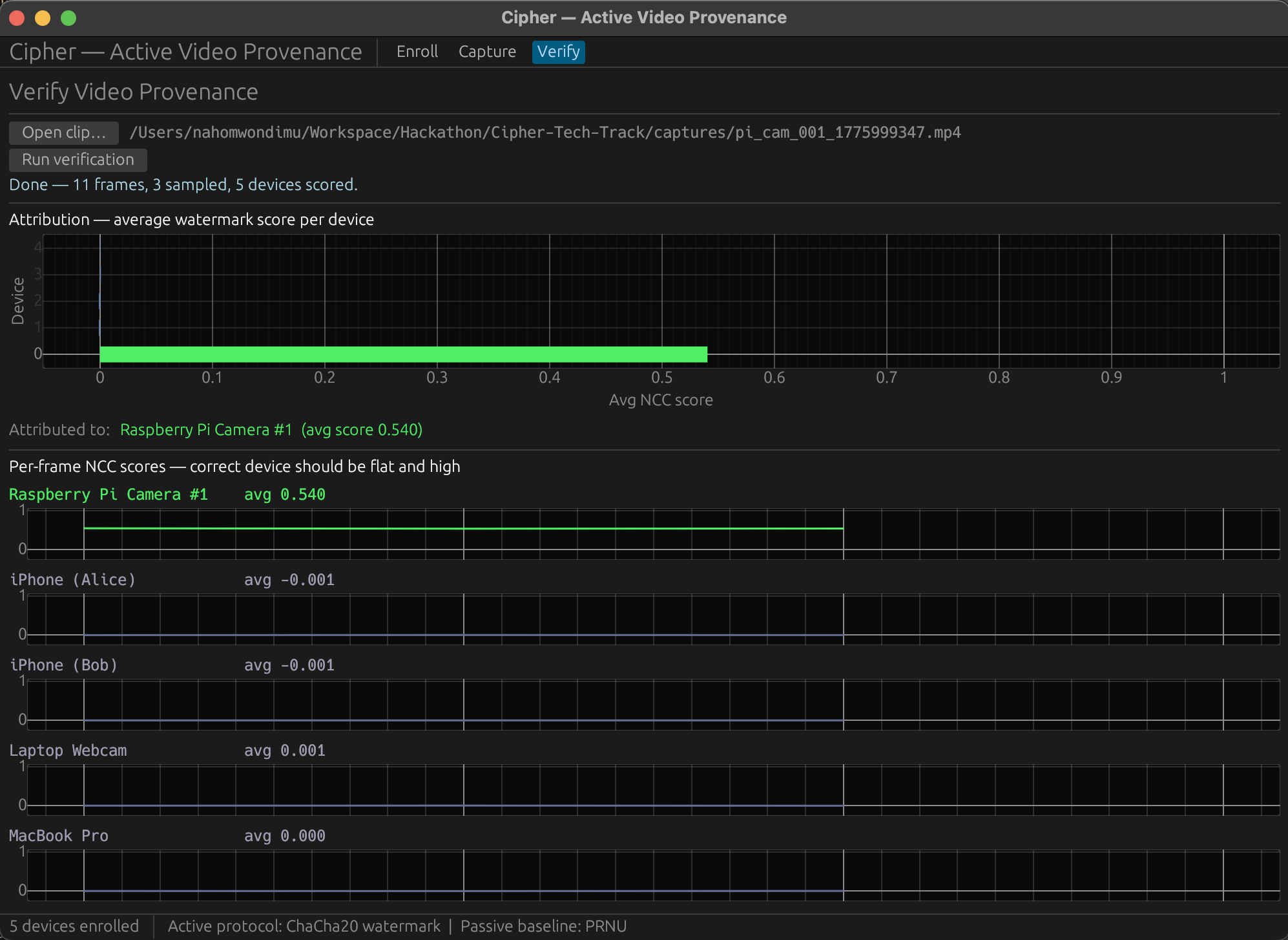 A Rust desktop app that stamps a cryptographic watermark into webcam footage as it's being recorded. No post-processing step. The file hits the disk already signed. Drop any clip into the Verify tab and it scores every frame against every enrolled device, showing both a bar chart of the best match and a sparkline across time.