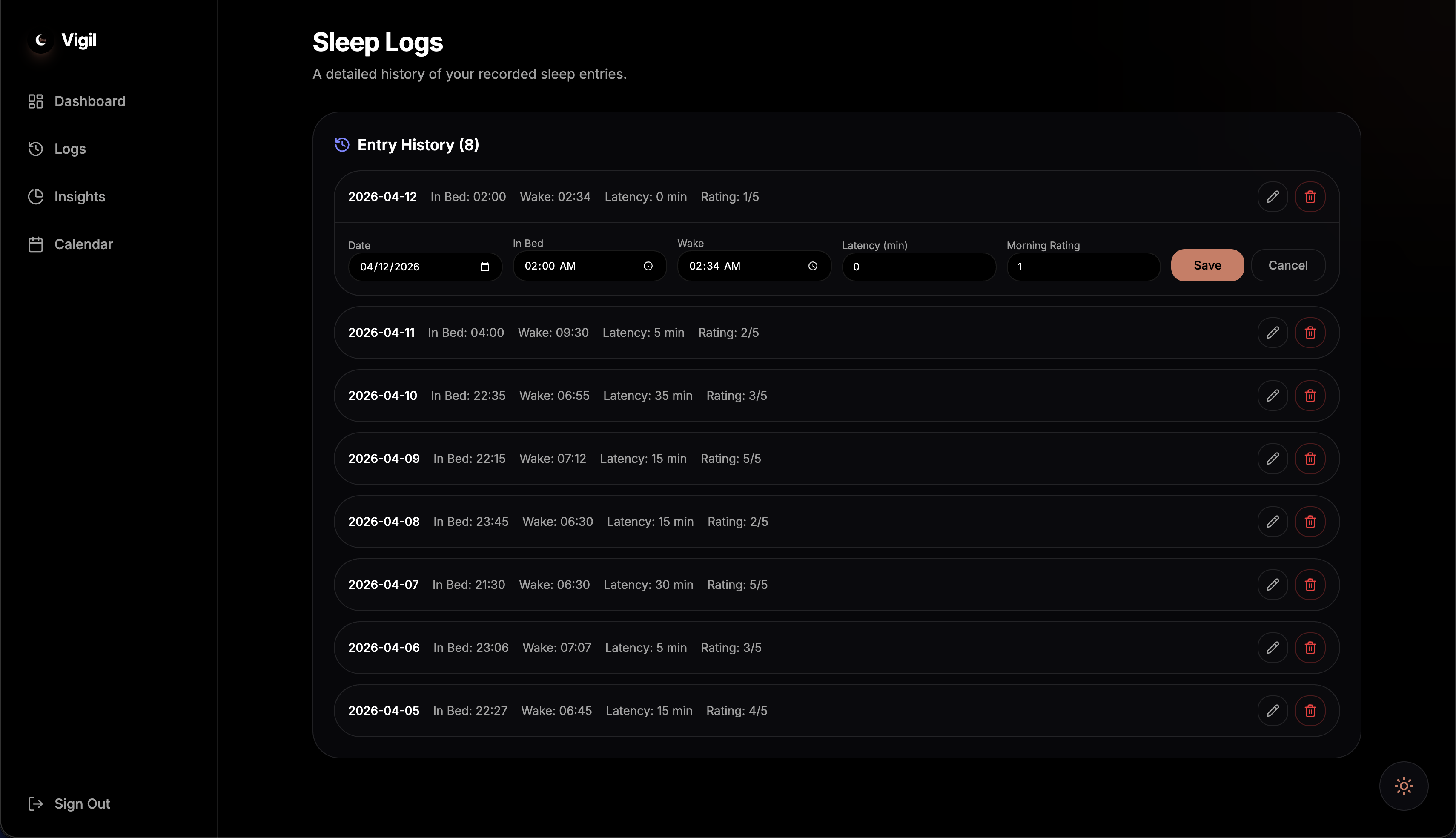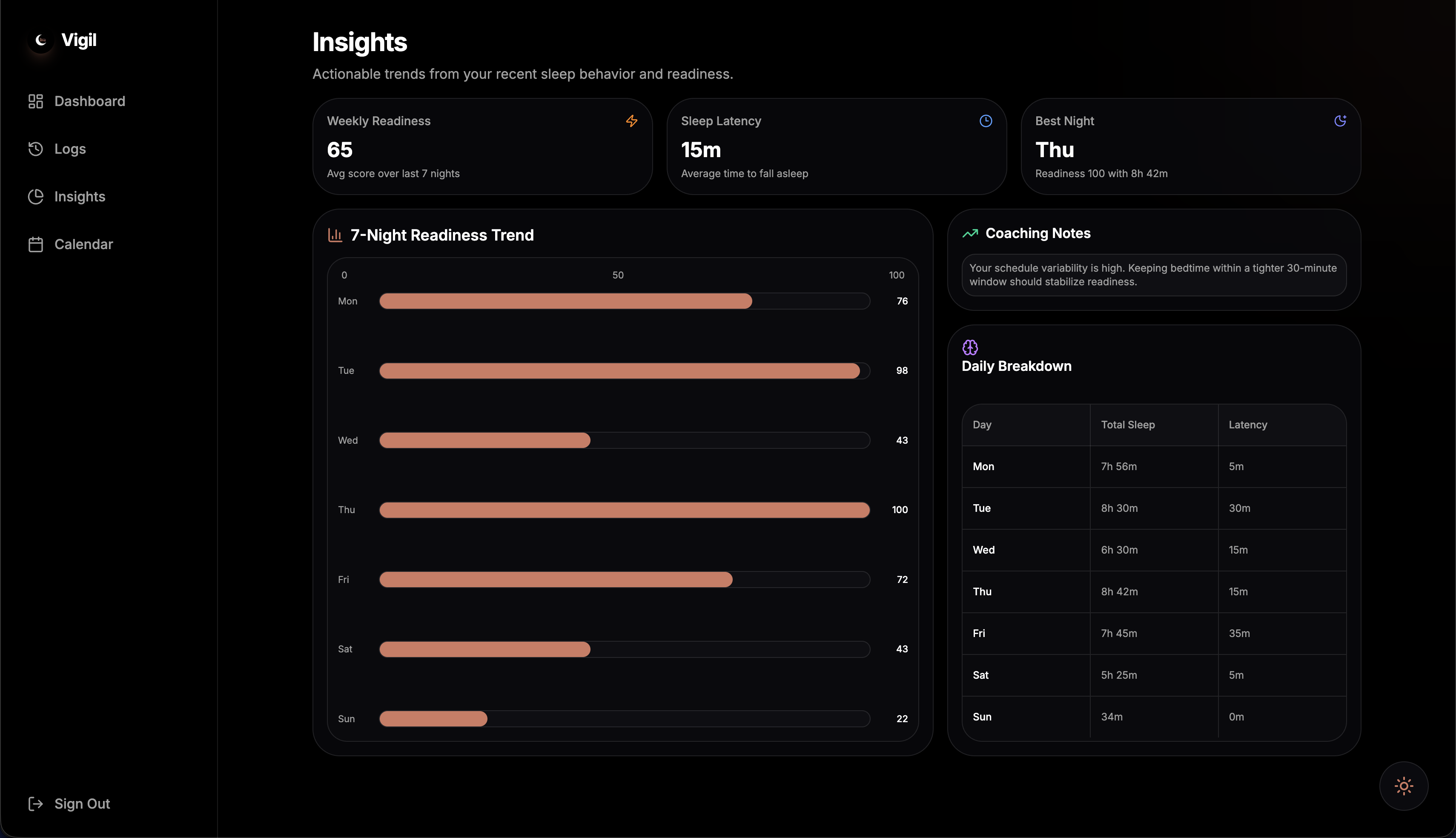 Vigil lets users log sleep (in-bed time, wake time, latency, morning rating), then generates actionable analytics: readiness, sleep debt, consistency, and productivity windows.