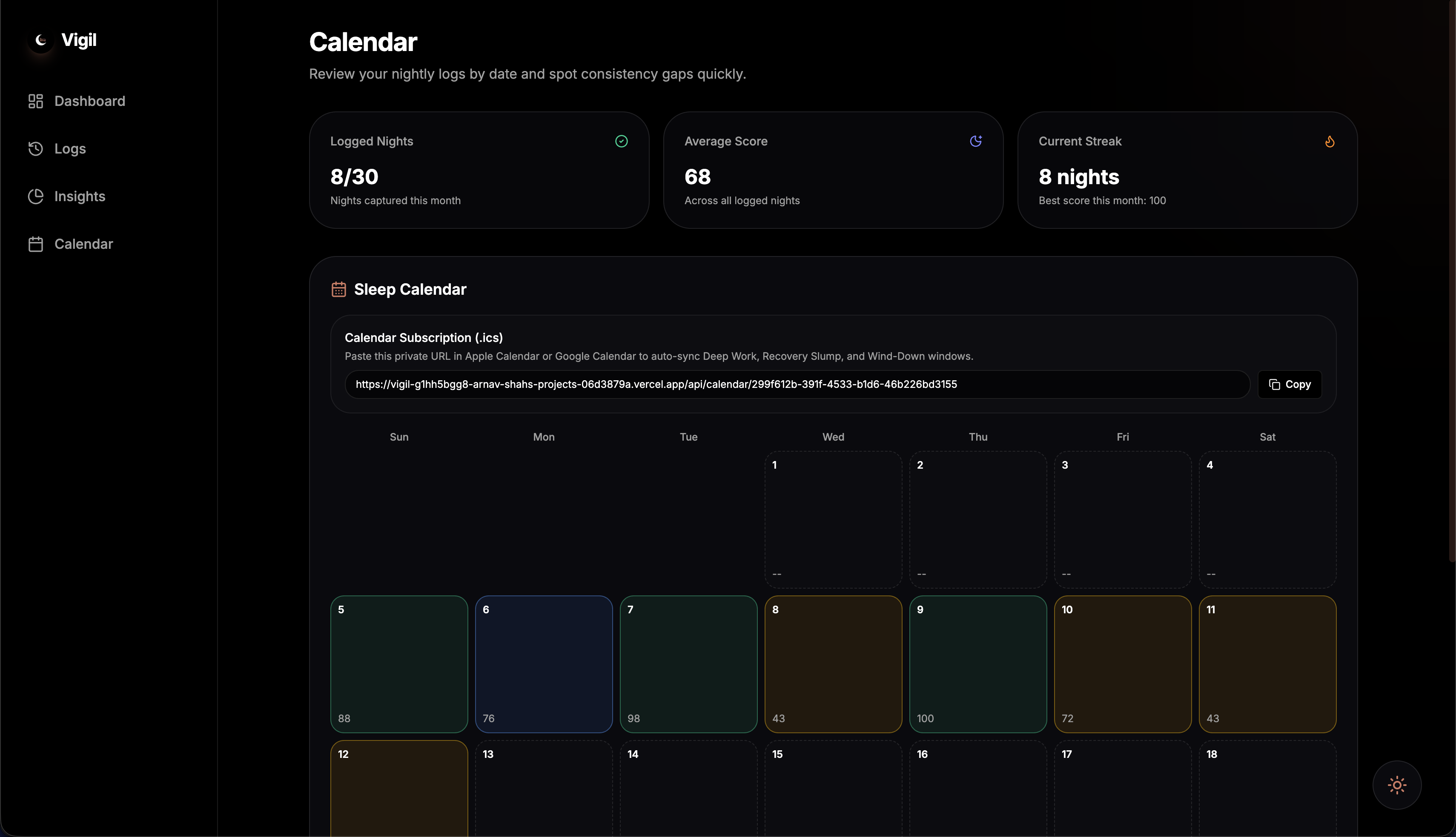 Most sleep apps gave us charts but not decisions. We built Vigil to turn nightly sleep into a practical game plan for the next day, so one quick log can guide when to focus, recover, and shut down.
