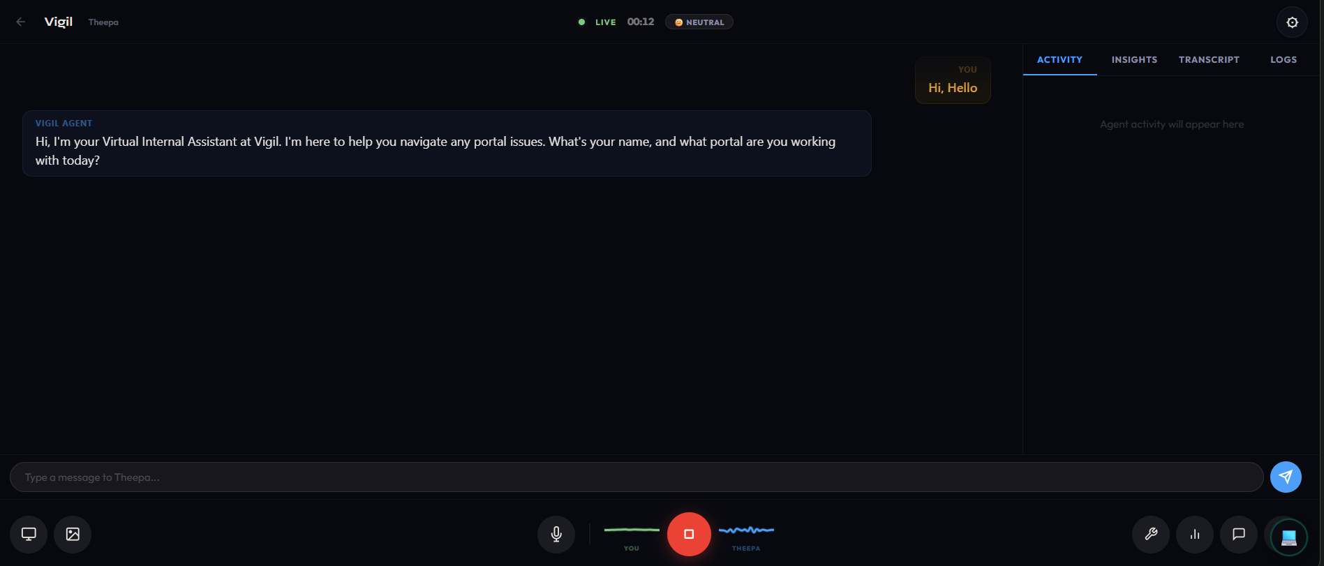 | Check System Logs during voice | Real-time agent transfers (Theepa → Vigil → Threat Intel) visible |