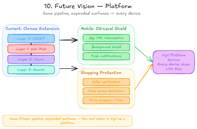 - Mobile-native Vigil — the real vision: every phone comes with this built in. An OS-level scam shield that protects every app, every browser, every interaction. No extension needed — the OS handles it. Vigil as a platform service.