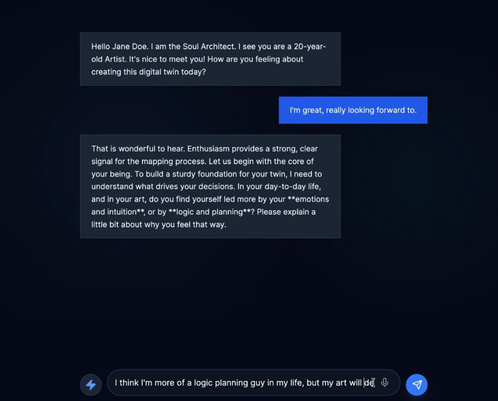 A key property: the more you talk with the Soul Architect, the more your Digital Twin becomes like you. Each calibration round adds evidence, resolves uncertainty, and sharpens the twin’s identity consistency.