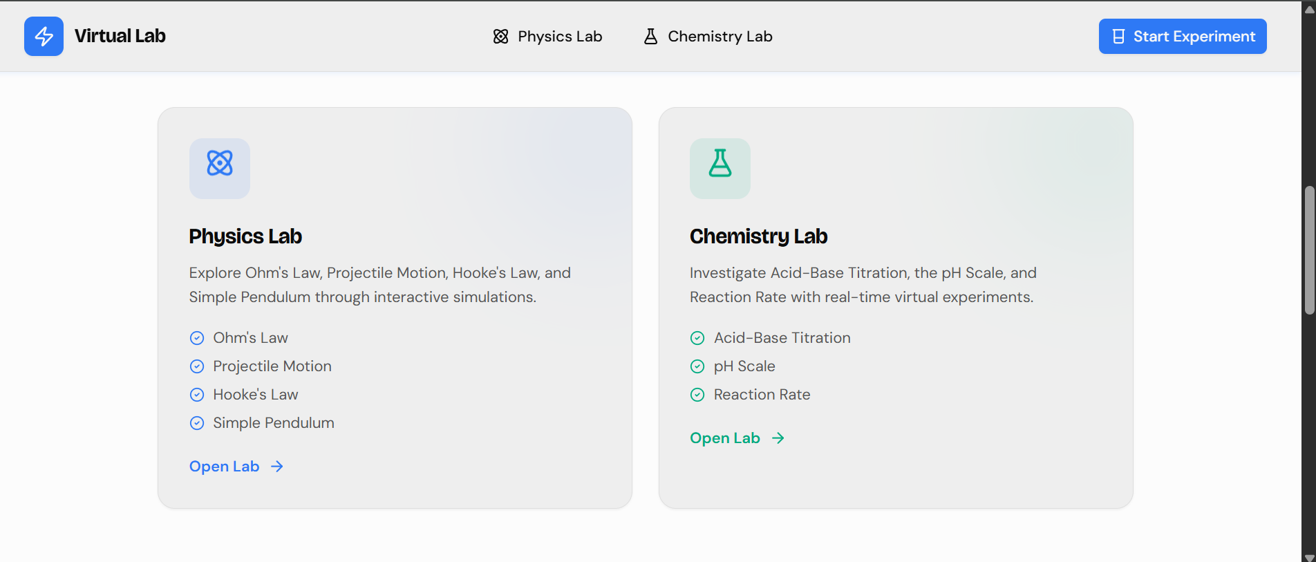 VirtualLab is an AI-powered platform that allows students to perform Physics and Chemistry experiments virtually. Users can interact with simulations, adjust variables, and observe real-time results through graphs and visualizations. It also provides AI-based guidance and automatically generates lab reports, making practical learning accessible without physical labs.