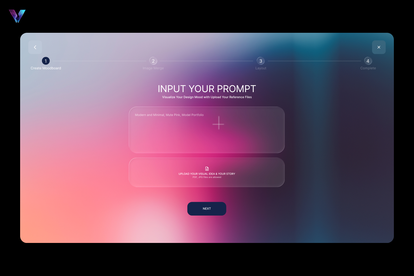 Users begin by entering design preferences through text prompts and uploading reference files to visualize their desired mood and contents