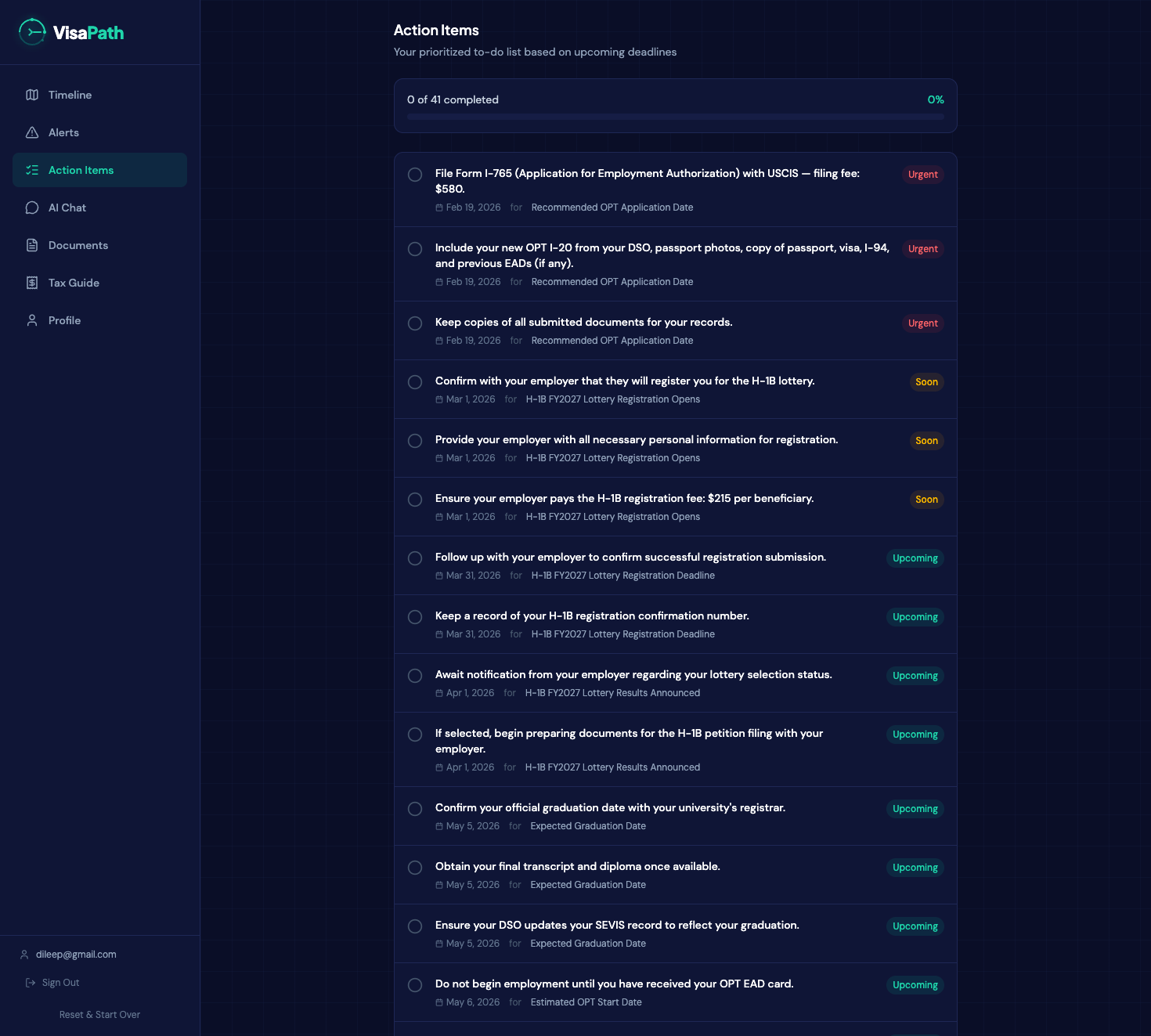 Beyond the user feedback: the timeline produces accurate, differentiated results across real scenarios. An F-1 STEM student from India gets a completely different roadmap than a non-STEM student from Brazil or an H-1B holder filing for a green card. Each one generates the right deadlines, the right risks, and the right action items for their specific situation.