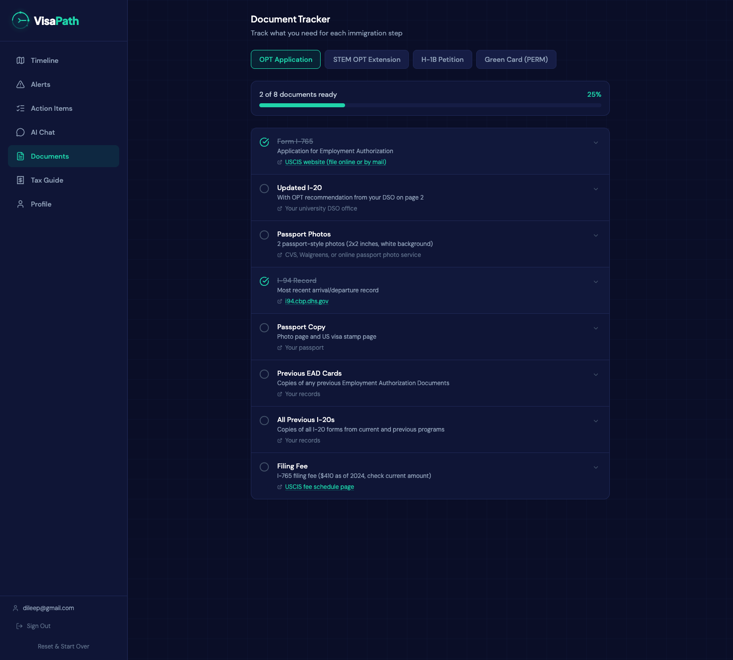 Document Tracker. Step-by-step checklists for OPT, STEM OPT, H-1B, and Green Card filings so you never scramble for paperwork at the last minute.