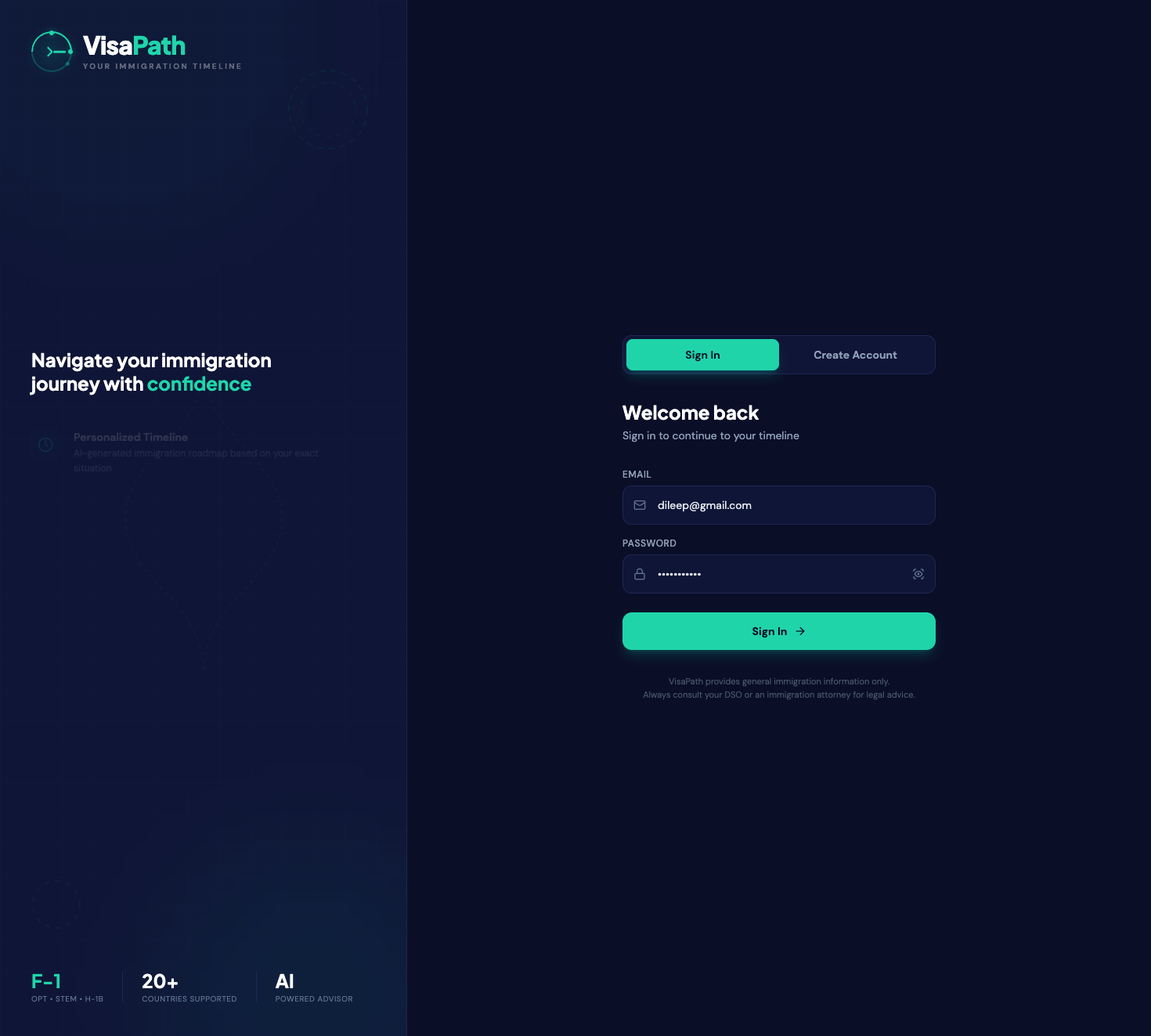 VisaPath is a personalized AI immigration timeline planner. You answer a few questions about your visa, program, and career goals, and it builds your complete immigration roadmap from today through green card eligibility.