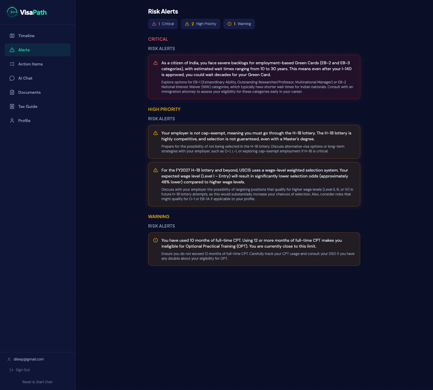 The system handles edge cases I didn't even plan for. A student who's used 11 months of CPT sees a critical warning about losing OPT eligibility. Someone from India gets a frank risk alert about 10-30+ year green card wait times with alternate path suggestions. An entry-level hire sees how the FY2027 wage-level lottery changes their H-1B odds.