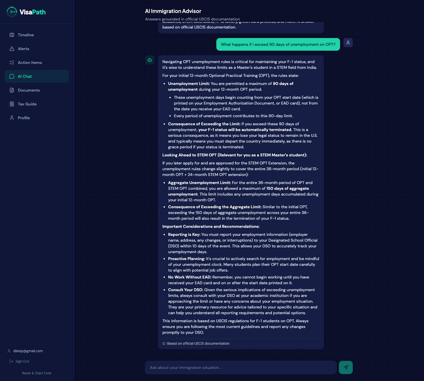 The part I'm most proud of technically: the AI doesn't get the last word. I don't just throw user data at Gemini and hope for the best. The backend injects 56 hardcoded USCIS rules (OPT windows, STEM OPT extensions, cap-gap, unemployment limits), current filing fees, H-1B lottery statistics from FY2024 through FY2027, and country-specific green card backlog data directly into the prompt. The AI generates grounded in these verified rules, not its training data. If Gemini 2.5 Flash hits its rate limit, the system falls back to Gemini 2.0 Flash automatically so the user never sees a failure.