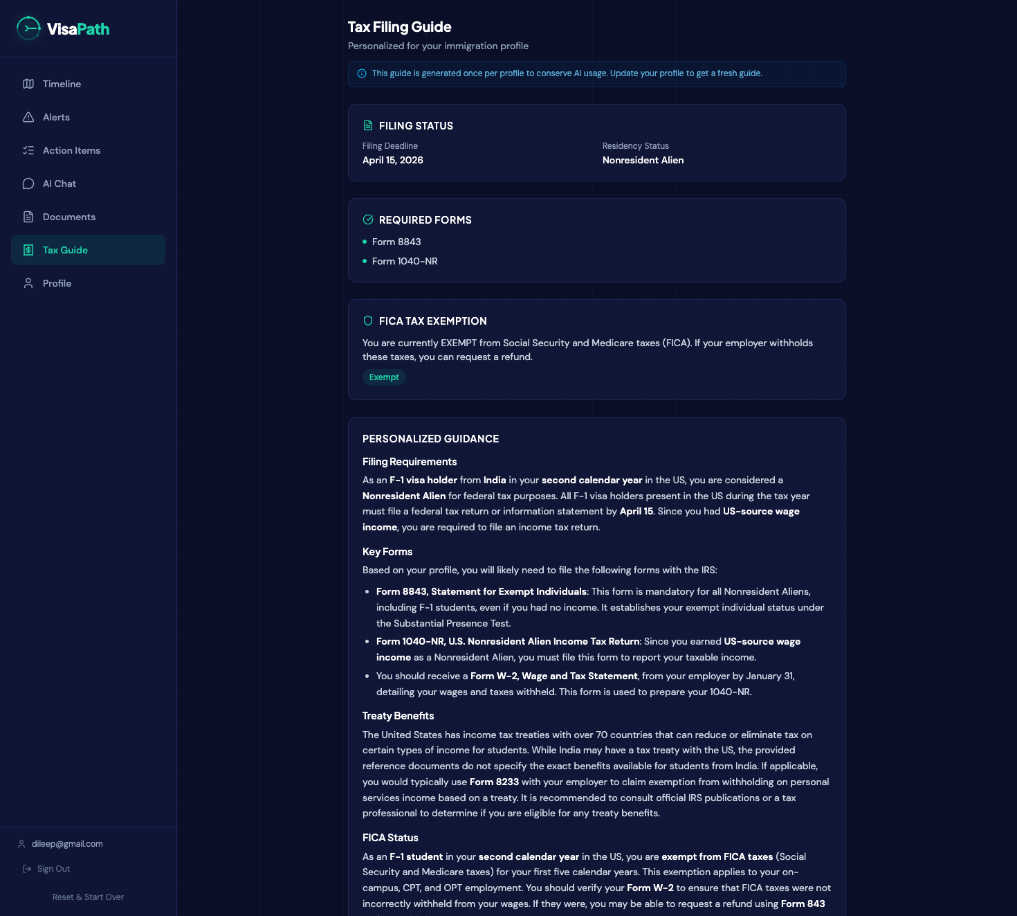 AI-generated tax filing guidance personalized to visa type, country, and treaty benefits