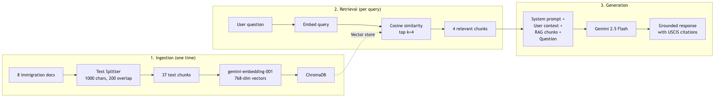 RAG pipeline: 8 immigration docs split into 37 chunks, embedded in ChromaDB, top-4 retrieval grounds every AI chat answer