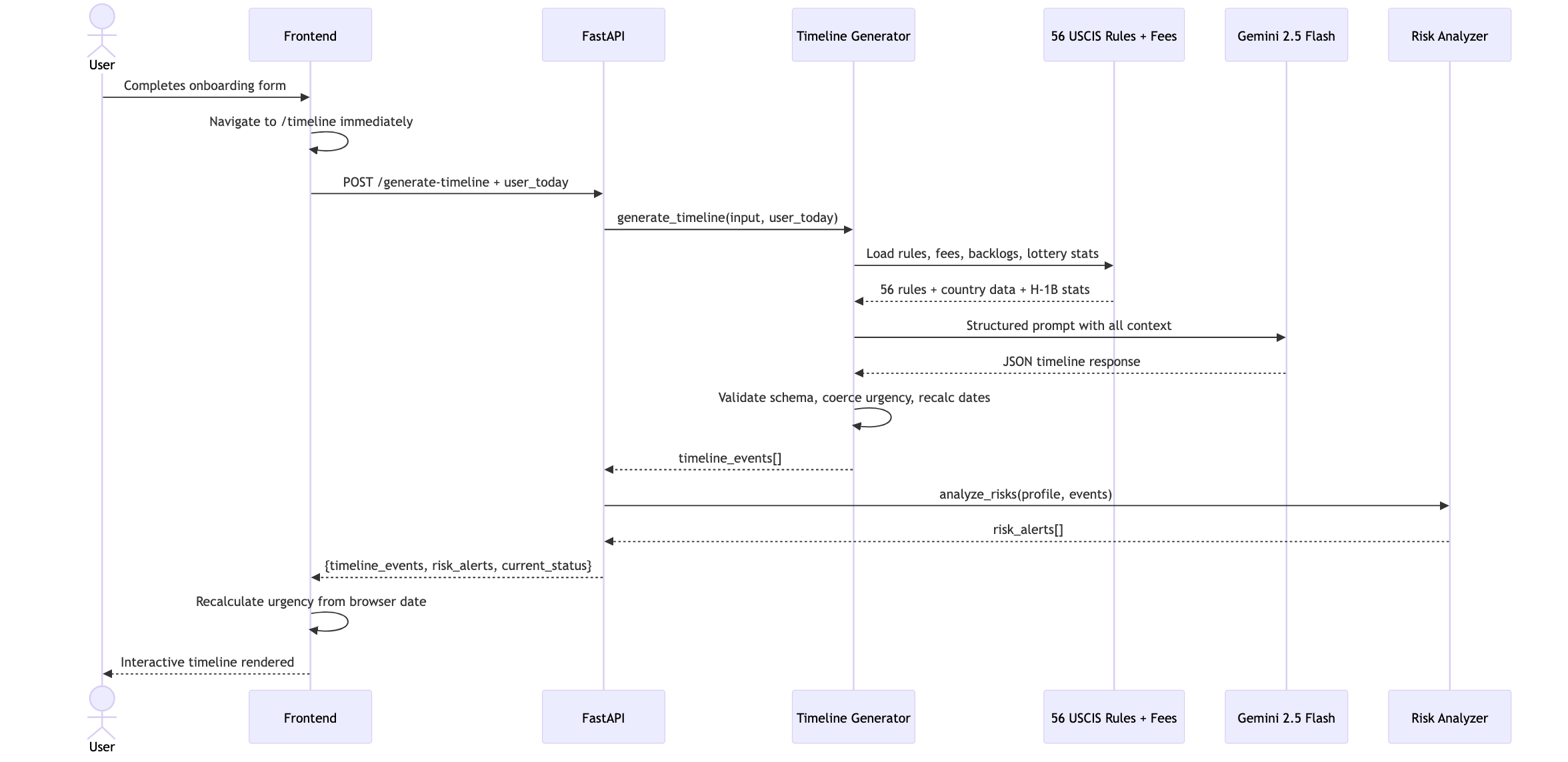 Timeline generation: 56 hardcoded USCIS rules injected into Gemini prompt, schema validated, urgency recalculated client-side