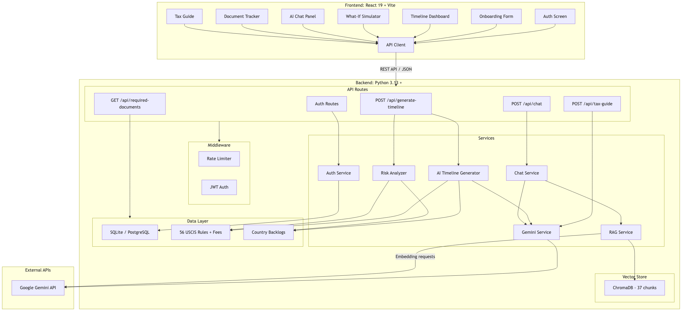 Full-stack architecture: React 19 frontend, FastAPI backend with 6 services, 56 USCIS rules, ChromaDB RAG, and Gemini 2.5 Flash