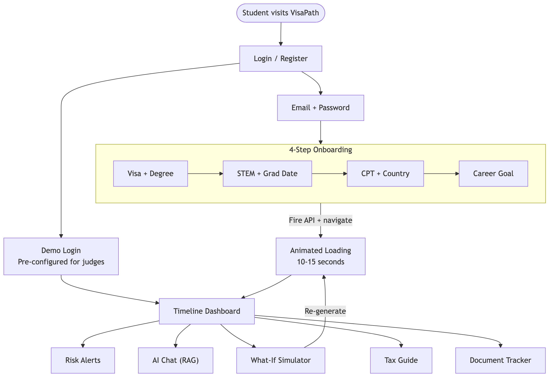 Student journey: demo login for judges, 4-step onboarding, animated loading, then timeline dashboard with 5 interactive features