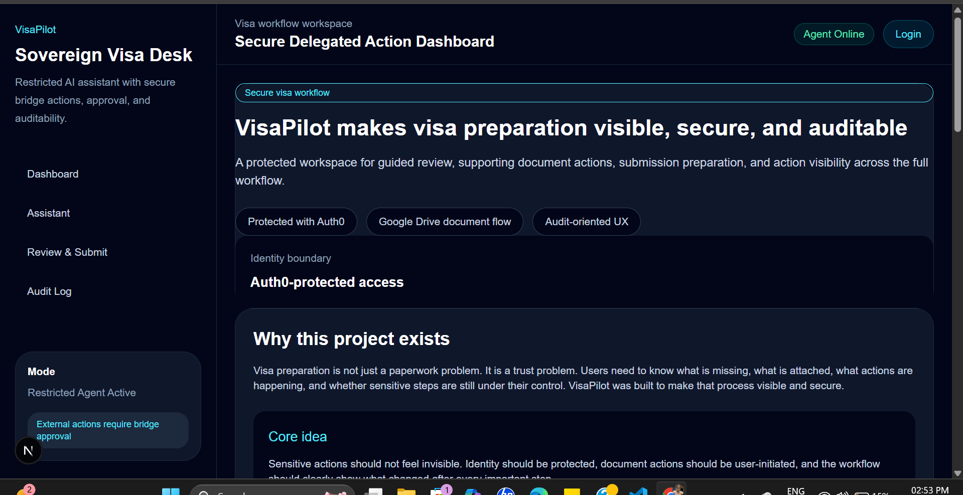 VisaPilot was designed around a simple but important idea: in a high-stakes workflow, sensitive actions should not feel invisible. In a visa preparation process, users often move across multiple systems, gather documents manually, and lose visibility into what is missing, what has already been attached, and what is happening before final submission. That is exactly where Auth0’s delegated-access model became important in shaping this project. The project description already focuses on protected identity, explicit document actions, and auditable workflow steps, and this bonus section explains the Token Vault-related direction behind that design in more detail.