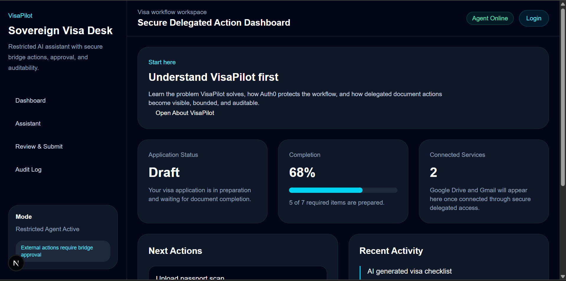 VisaPilot is a secure visa workflow assistant that uses Auth0 for protected identity and controlled access, while helping users move through a visa preparation flow with a clearer operational workspace.