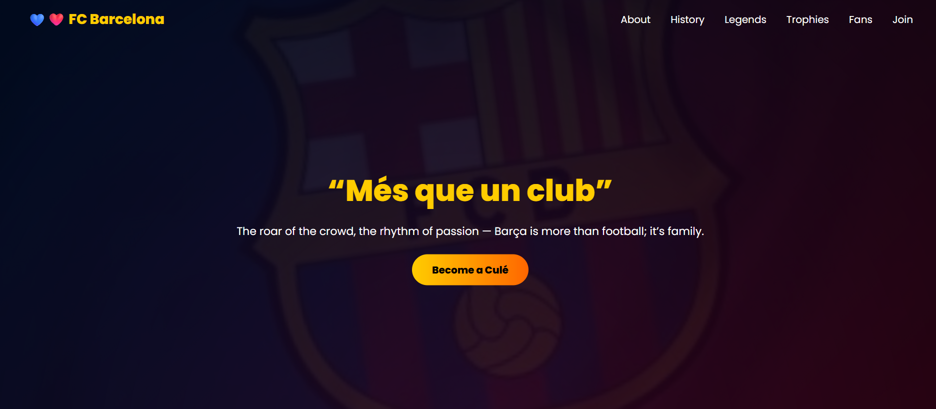 Building a visually compelling, interactive experience using only HTML and CSS felt like a true design victory. The project manages to capture the emotional essence of FC Barcelona — bold, unified, and proud — while staying minimal and accessible.