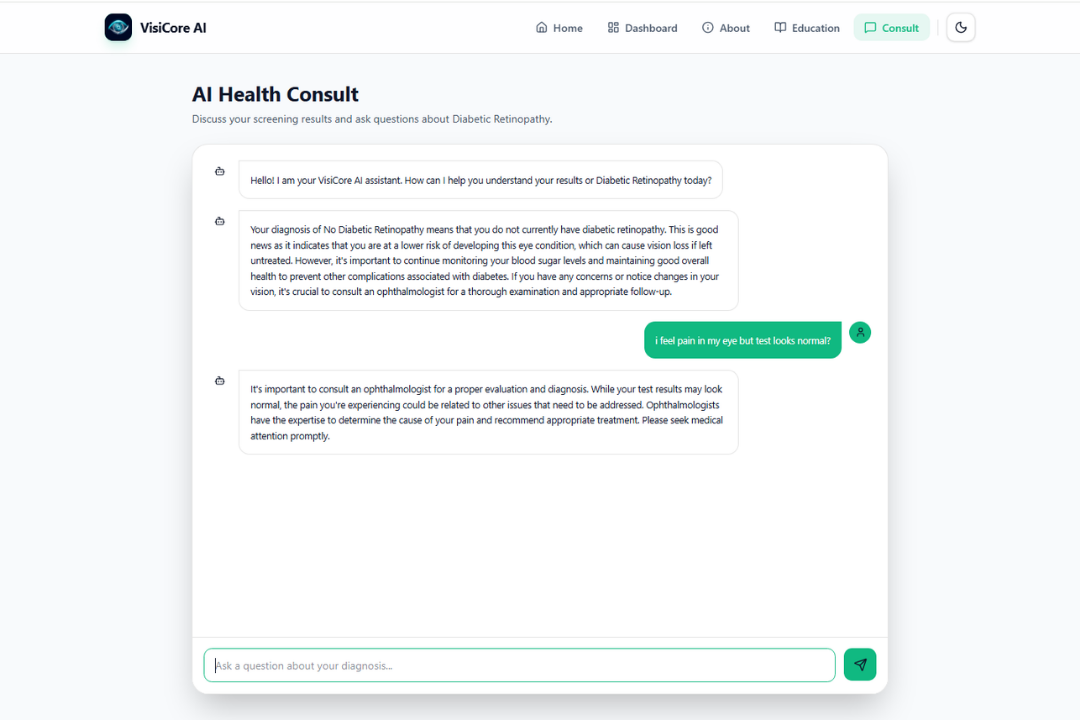 Dual-AI Architecture: The combination of a vision-specialized deep learning model (ViT) for diagnosis AND a conversational language model for patient communication is a novel and practical approach — mimicking how a real specialist would both diagnose AND explain.