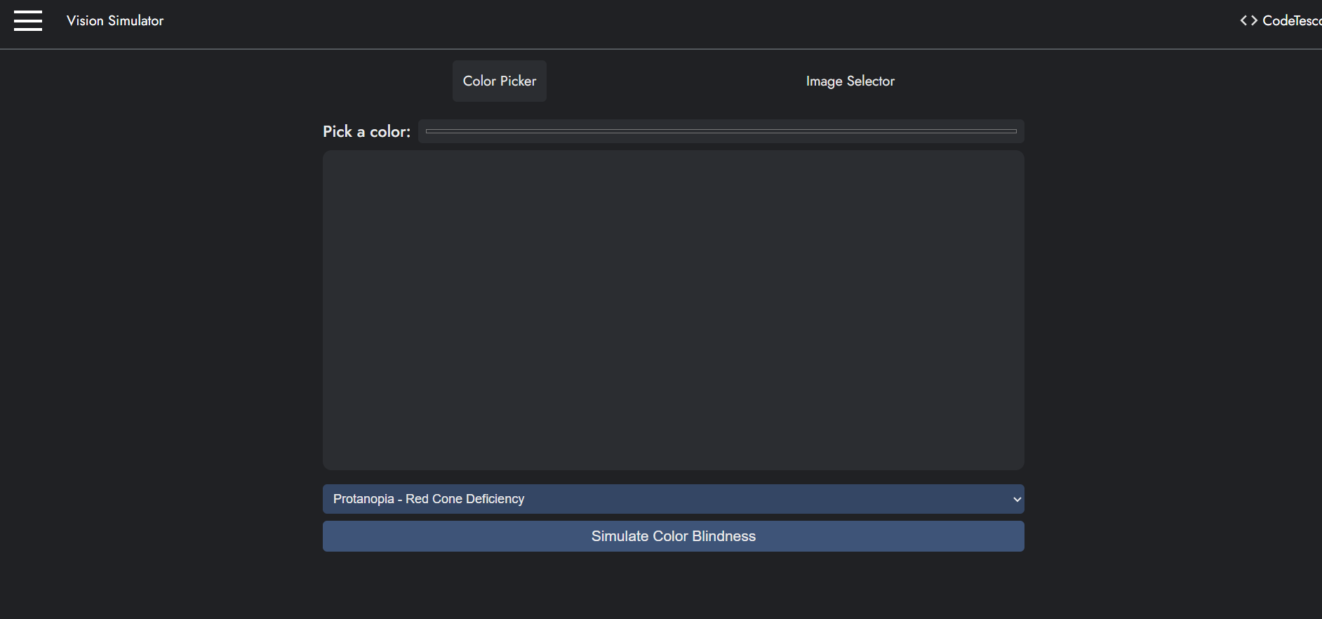 Vision Simulator is a single-page application that simulates the major types of color blindness. It allows designers and developers to preview how their interfaces appear to users with different visual impairments, encouraging the creation of applications that are usable and comfortable for everyone.