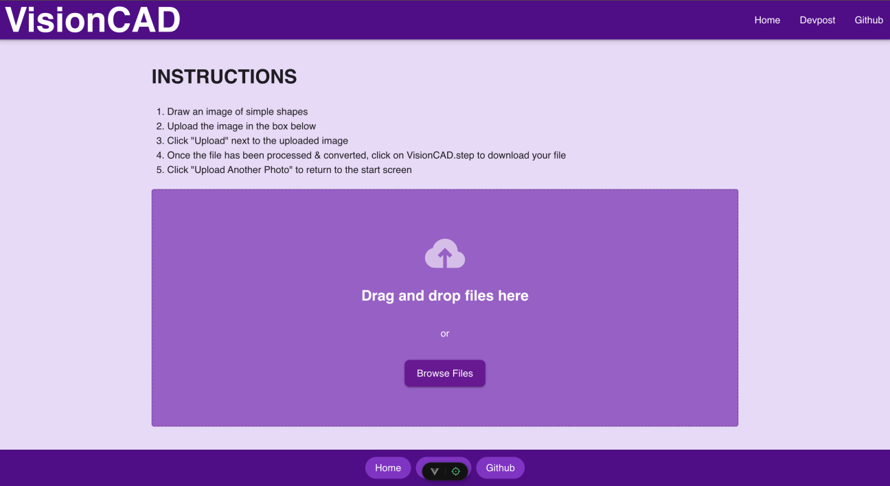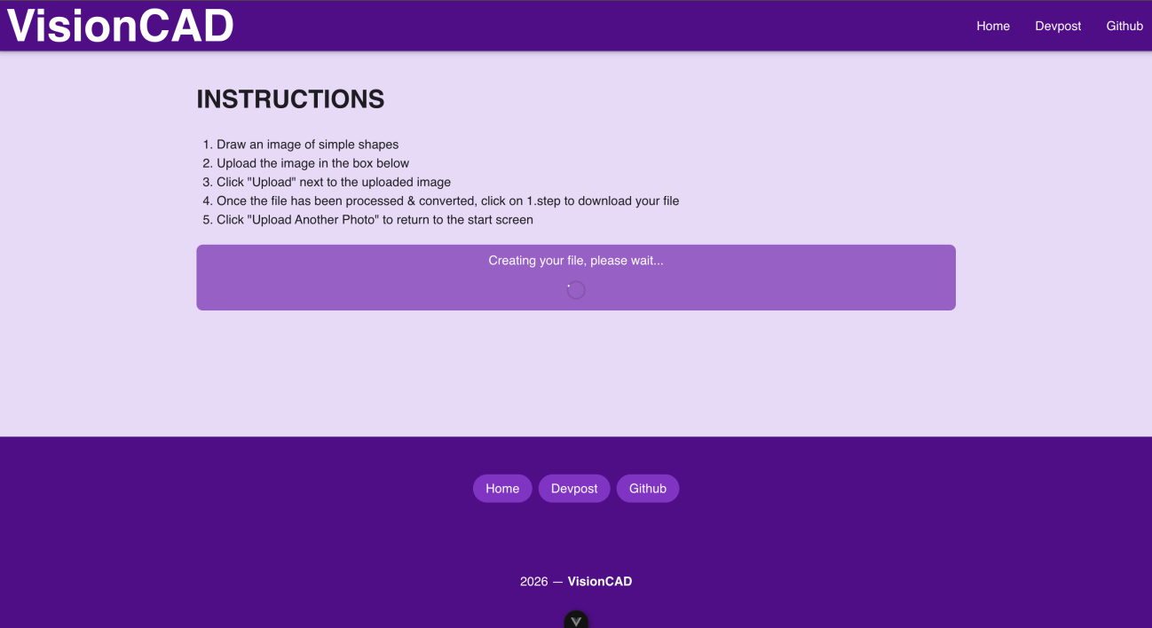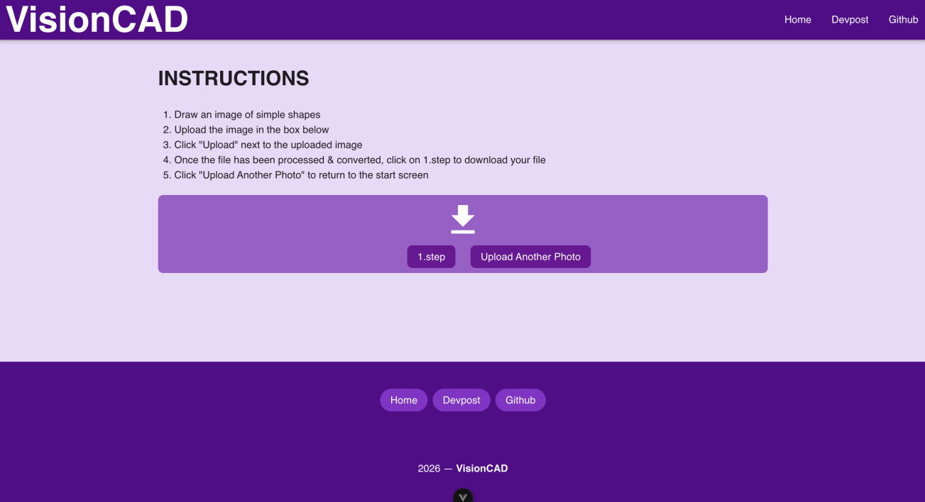 VisionCAD is a tool that converts hand-drawn sketches into 3D CAD models. By uploading a drawing, users can automatically generate a CAD file that can be opened in professional modeling software such as Onshape or SolidWorks.