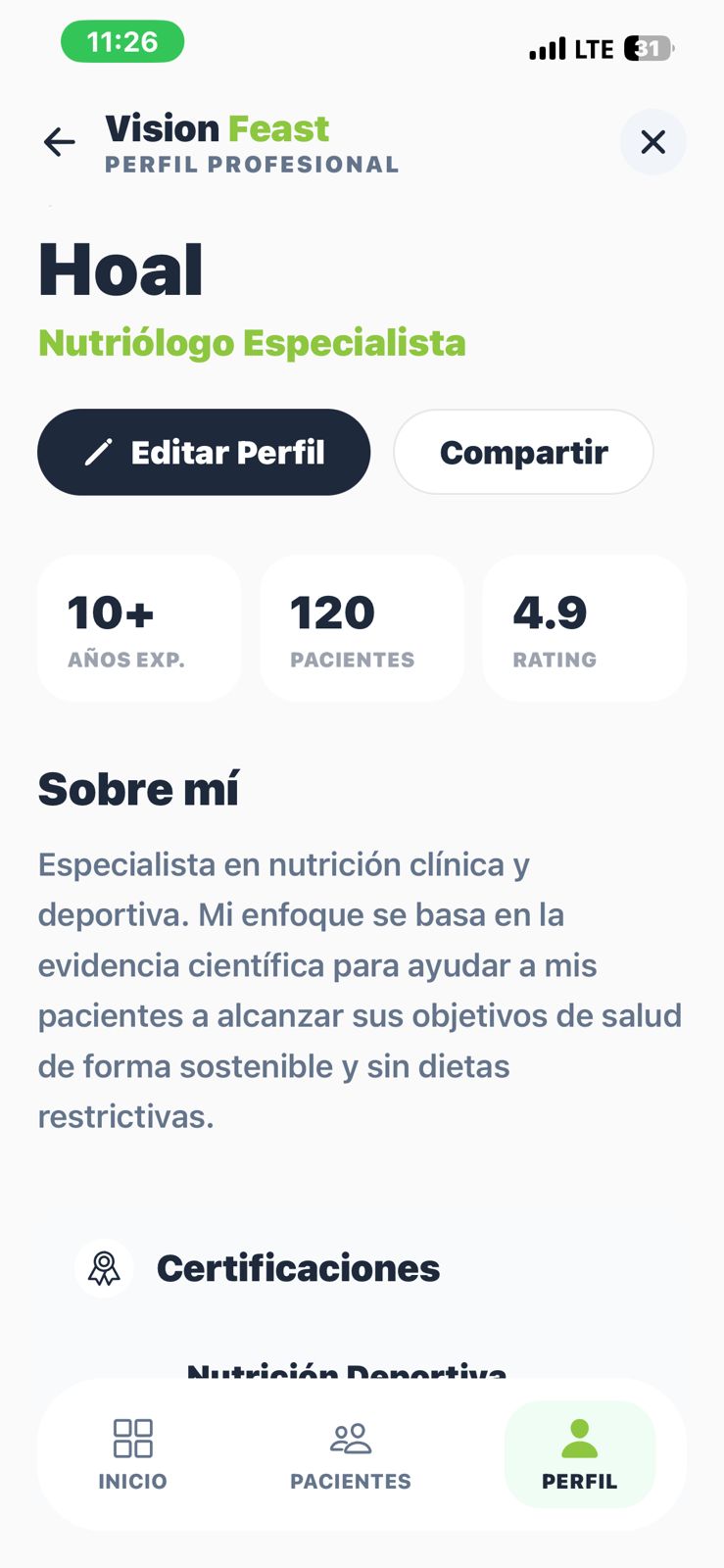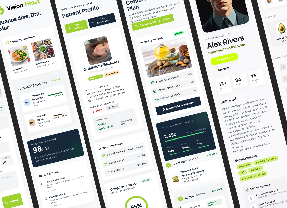 Por otro lado, la plataforma permite la interacción con profesionales como nutriólogos, entrenadores y psicólogos, quienes pueden gestionar a sus pacientes, revisar su progreso real y ajustar planes de manera personalizada. Esto convierte a Vision Feast en un ecosistema colaborativo donde la IA apoya, pero el factor humano sigue siendo fundamental.