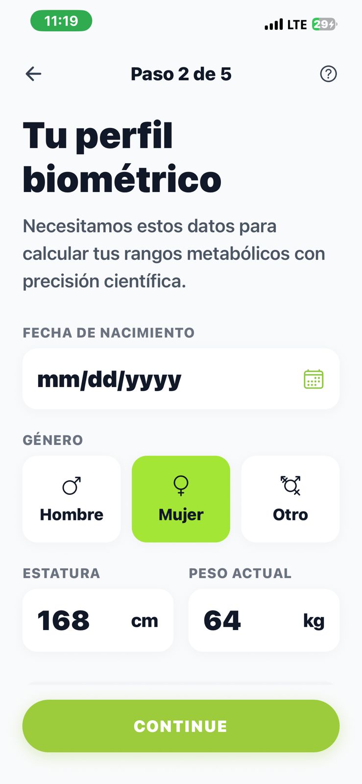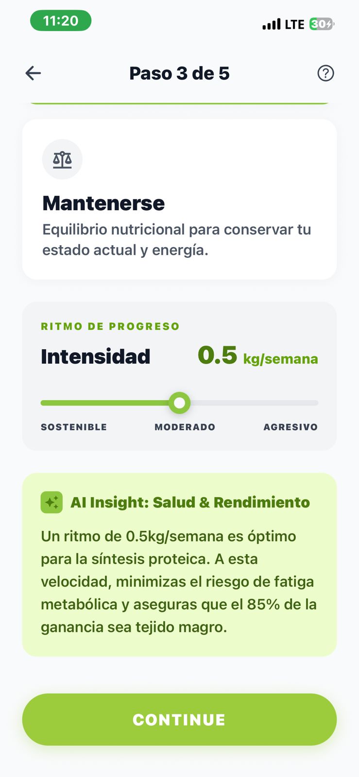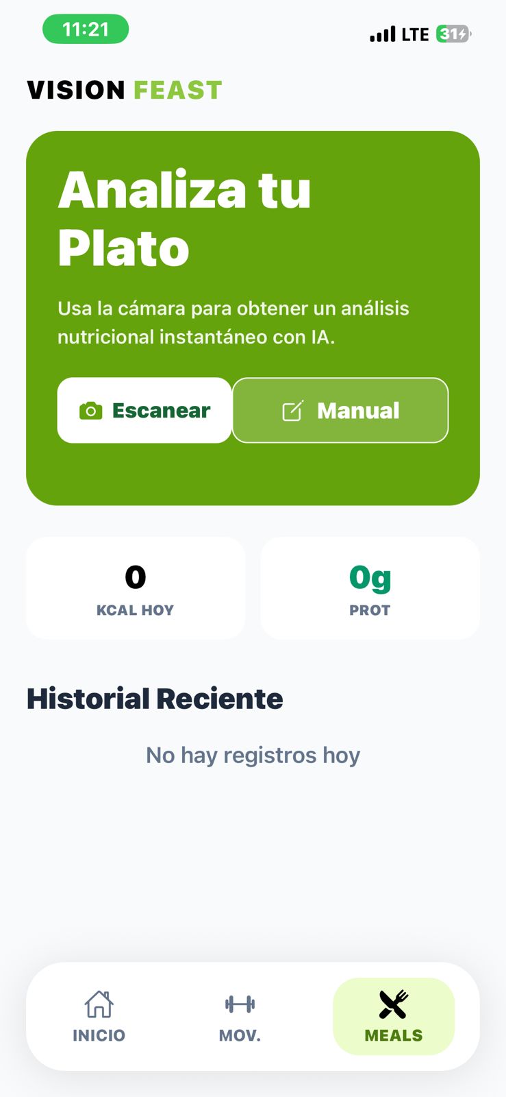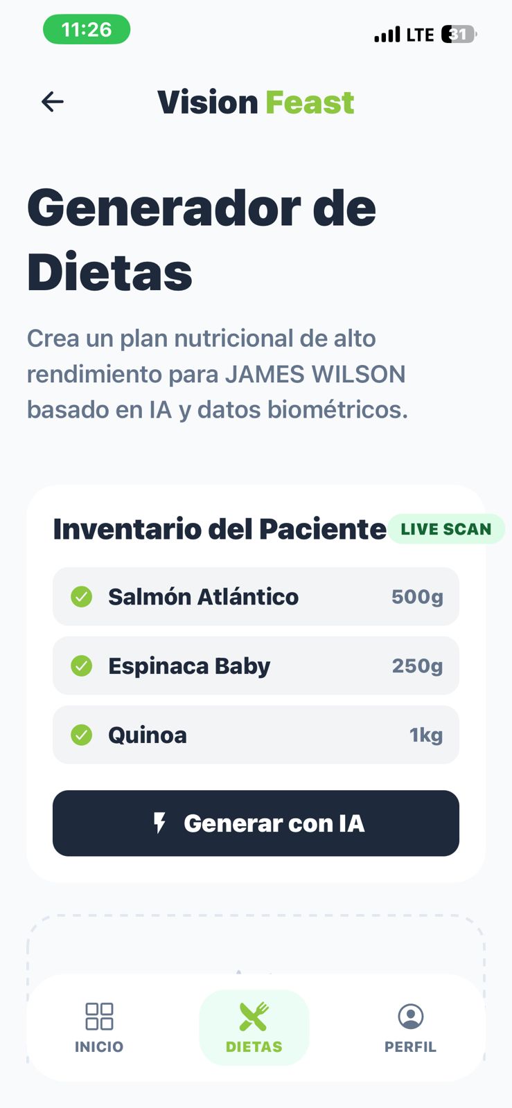 El usuario puede registrar su información biométrica y objetivos personales, y a partir de esto la aplicación genera un perfil personalizado. Una de sus funciones principales es el escaneo de alimentos mediante IA, donde el usuario simplemente toma una foto de su comida y el sistema analiza los ingredientes, estimando calorías y macronutrientes en tiempo real.