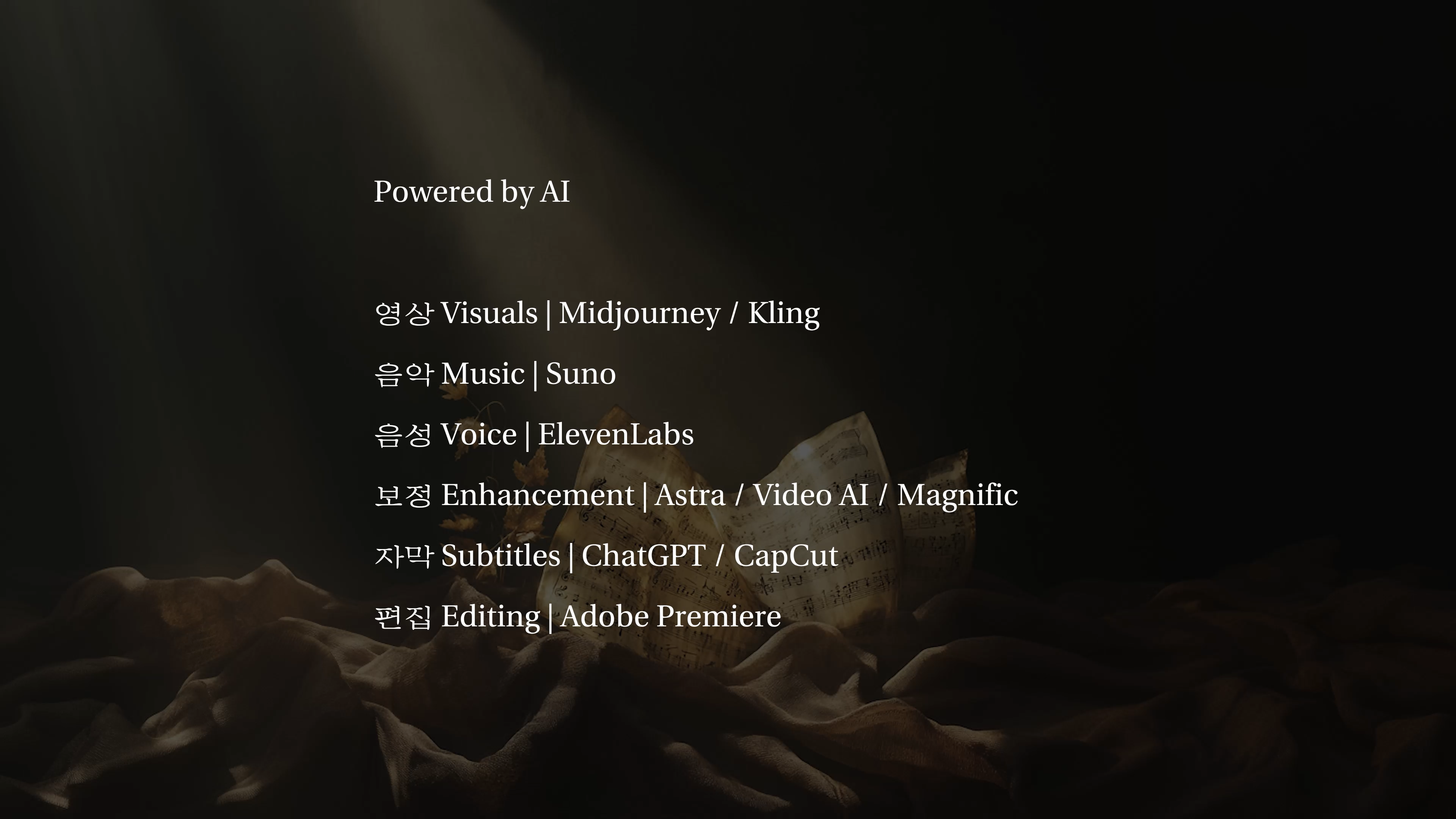 Palaeropira is a 5-minute experimental AI visual opera that transforms traditional classical aria into cinematic narrative imagery. Voice narration created with ElevenLabs serves not merely as narration, but as a key dramatic element that drives the film's mystical atmosphere and emotional depth.