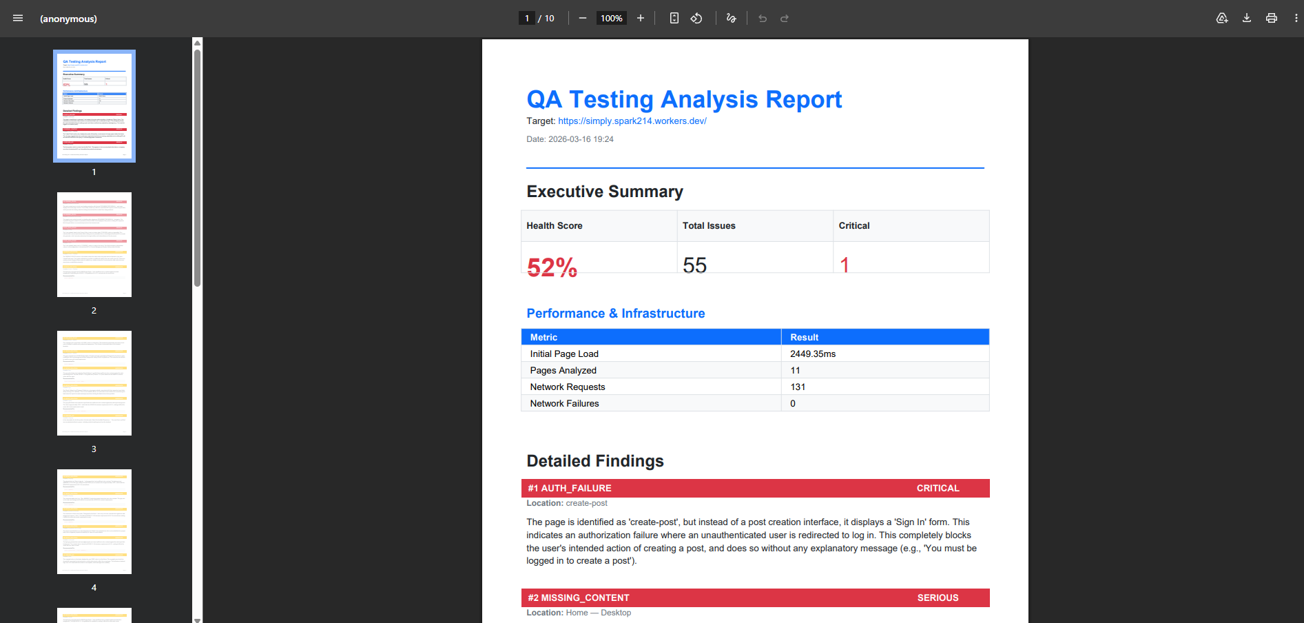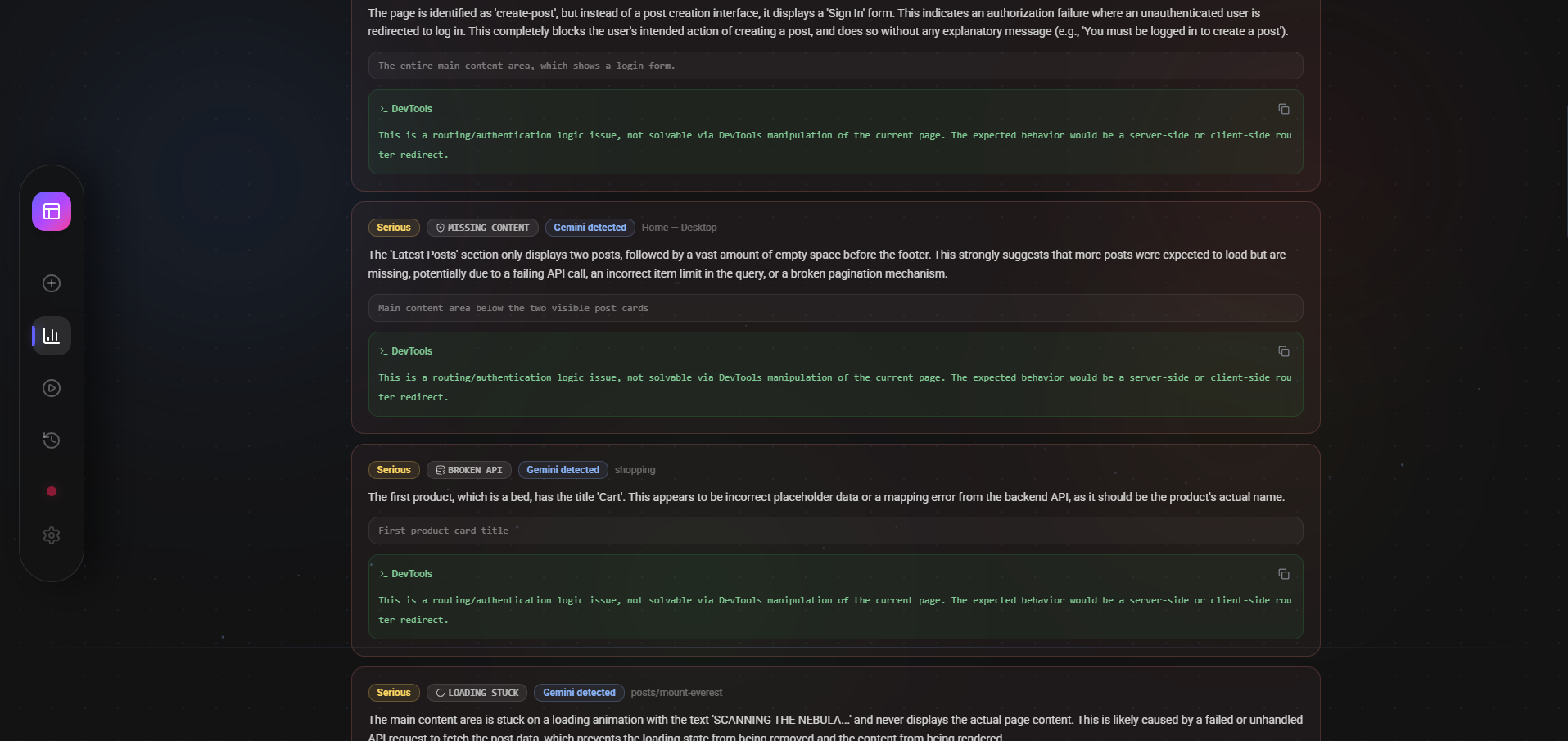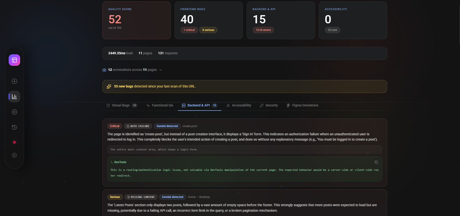 - Deep Full-Stack Inspection: While the agent navigates, it operates a "Network Interceptor" to monitor backend health. It detects broken API responses (4xx/5xx), identifies slow-loading endpoints, and flags potential security vulnerabilities like unhandled CORS or JS exceptions.