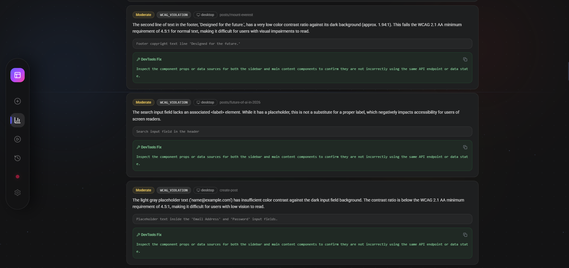 - Deterministic Fix Generation: It doesn't just find problems; it solves them. Every bug in the generated report comes with a verified CSS fix and a one-click DevTools console command, allowing developers to ship fixes in seconds.