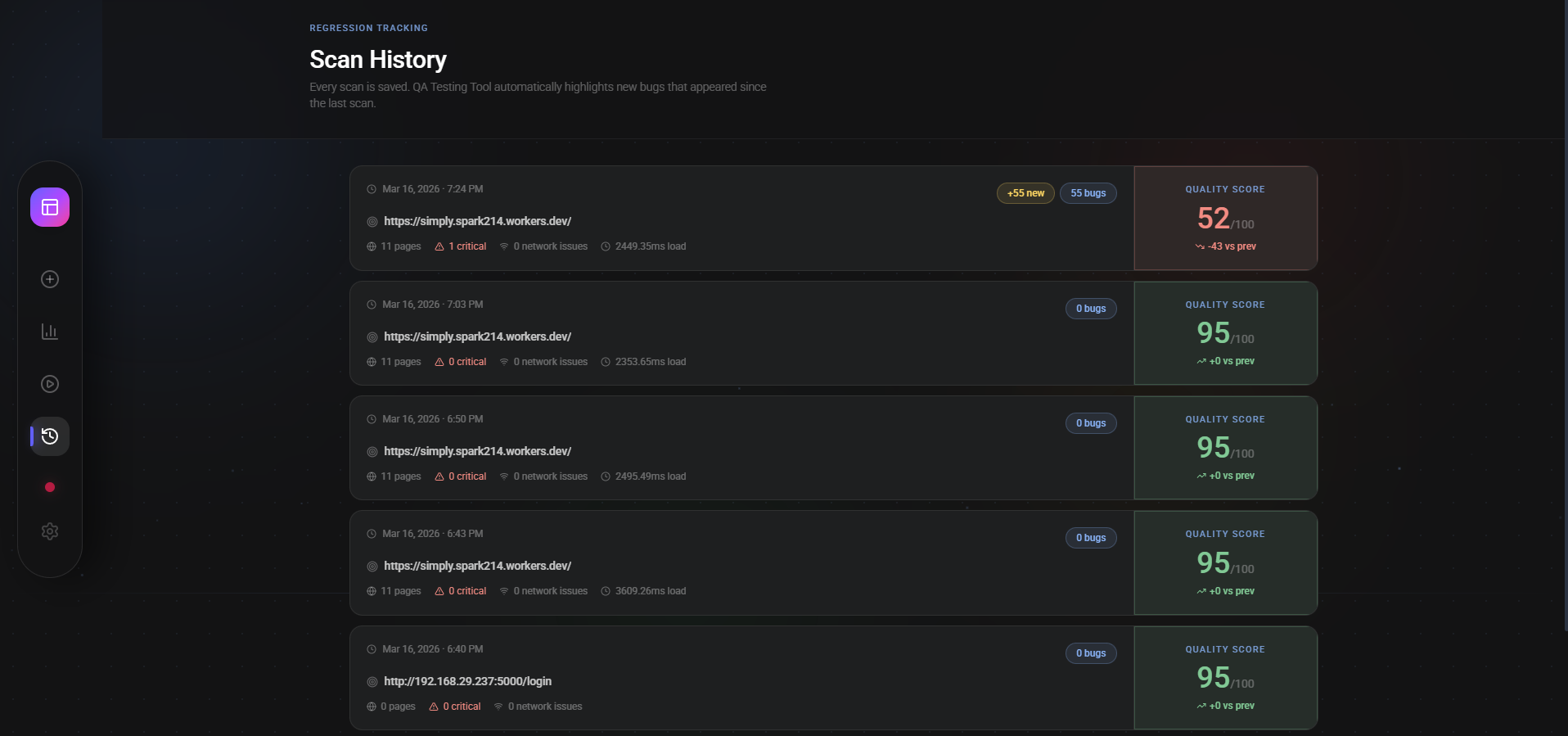 - Backend: A FastAPI backend manages the scan queue, while SQLite provides persistent history tracking.