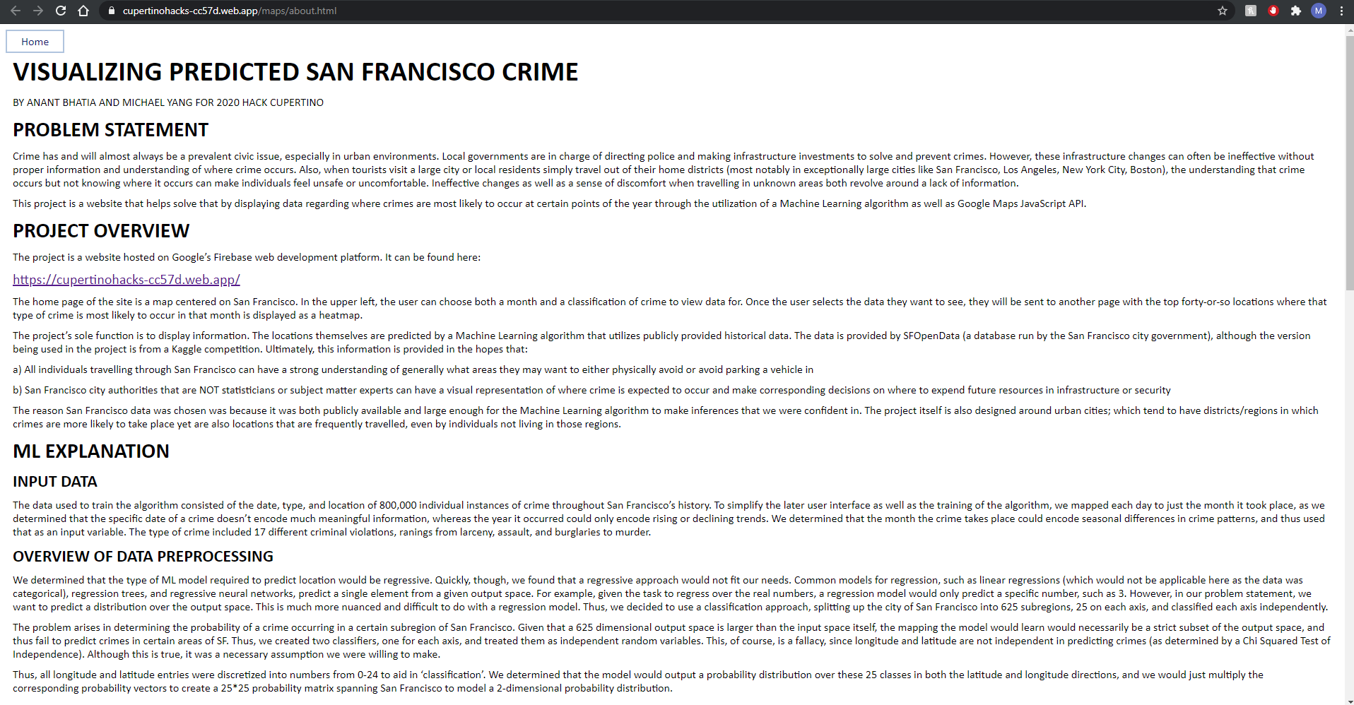 The three minute video is not nearly long enough to properly explain the entirety of the project. The below descriptions are more detailed and offer much more information regarding the site's inspiration and development. For more insights into our coding process, please read the devlogs, which are records of daily progress. For another look towards the ethics and potential impacts of a website like this, please click the "ethics" button to see a short article: that explains our concerns and rationale. This project was built with a lot of passion—not only for coding, but also for discussion and information regarding the handling of crime in urban cities—and I hope you can see that!