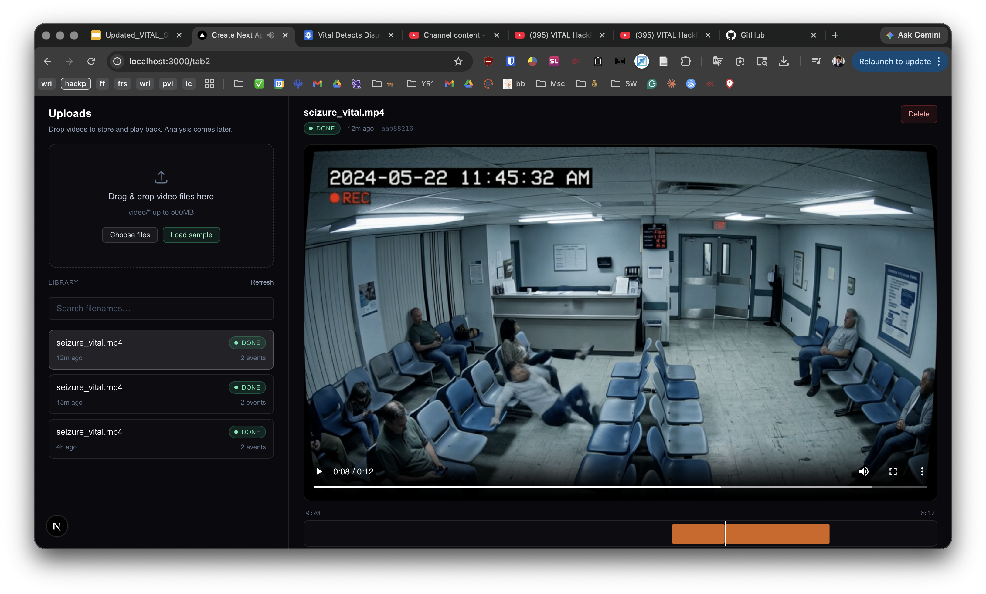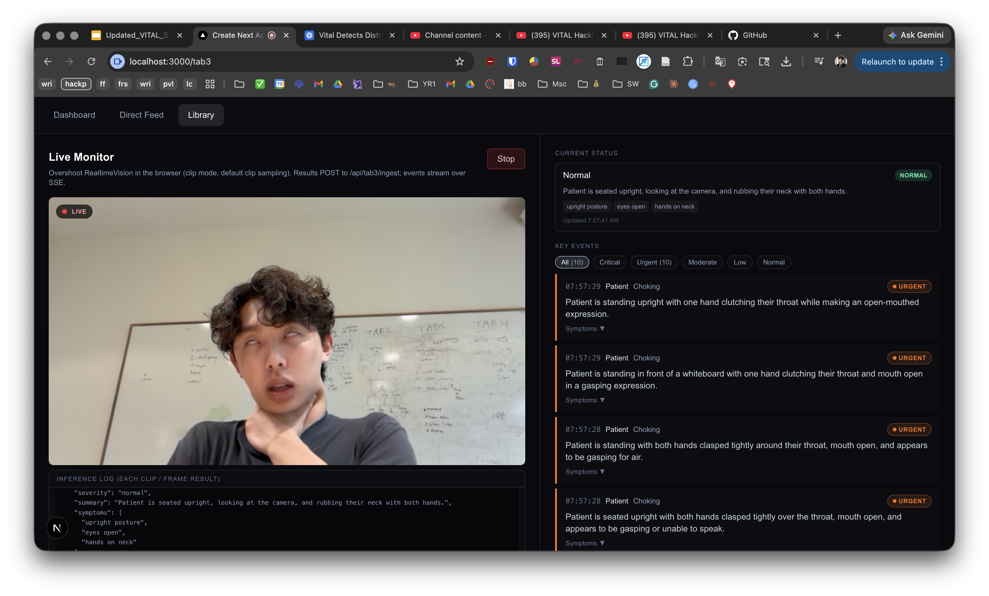 We built VITAL by combining computer vision models for pose and motion detection with a rule-based risk scoring system. The system processes video input, extracts behavioral signals such as movement and posture, and converts them into real-time triage alerts. The system detects and tracks individuals within video feeds, analyzes behavioral signals, and identifies potential medical emergencies such as seizures, choking, bleeding, stroke symptoms, or loss of consciousness. Detected events are triaged by severity and surfaced to healthcare staff through visual alerts, logs, and notifications.