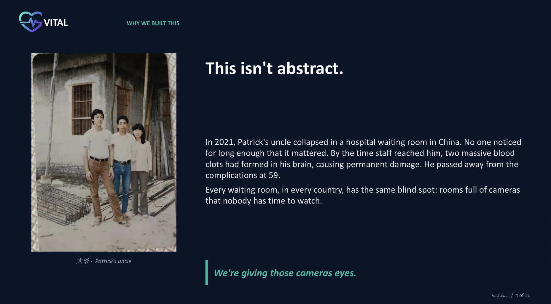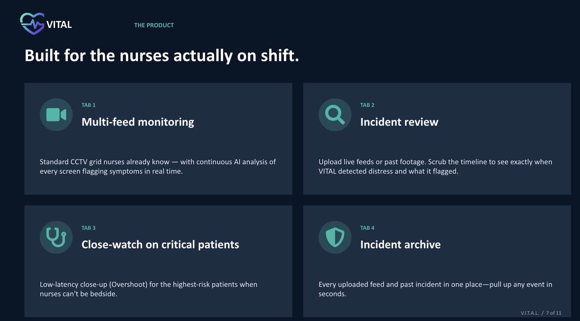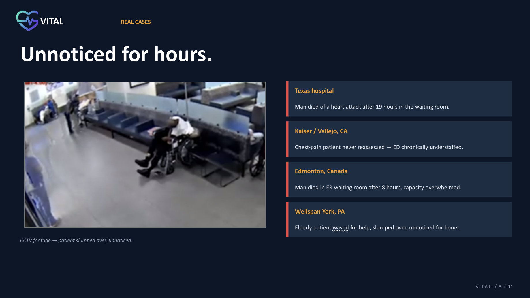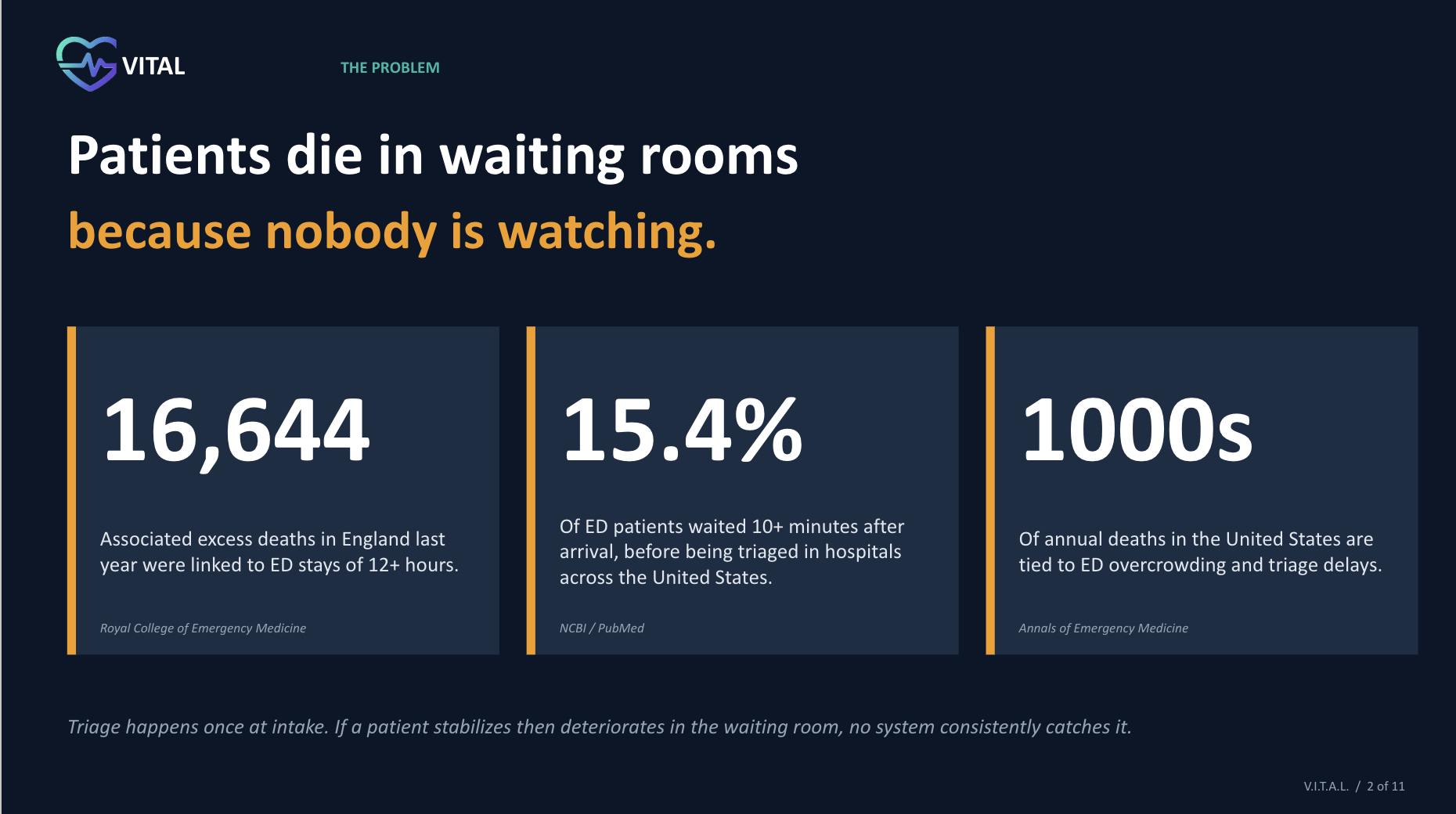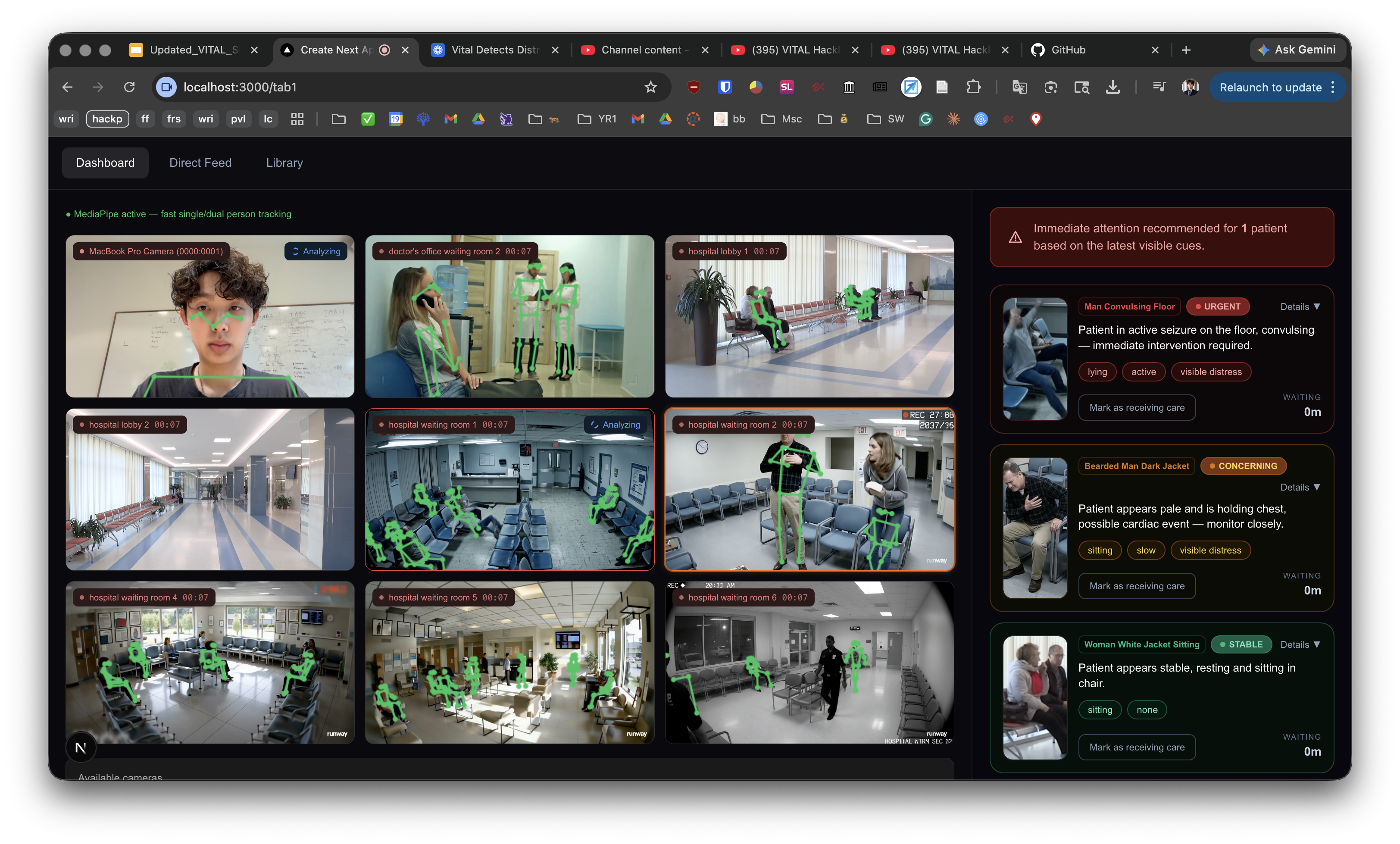 VITAL is an AI-powered camera system that passively monitors waiting rooms in real time, detecting signs of patient distress or deterioration and flagging high-risk individuals. It provides simple risk-level alerts and notifications to help medical staff prioritize attention more effectively. The platform consists of three main interfaces: